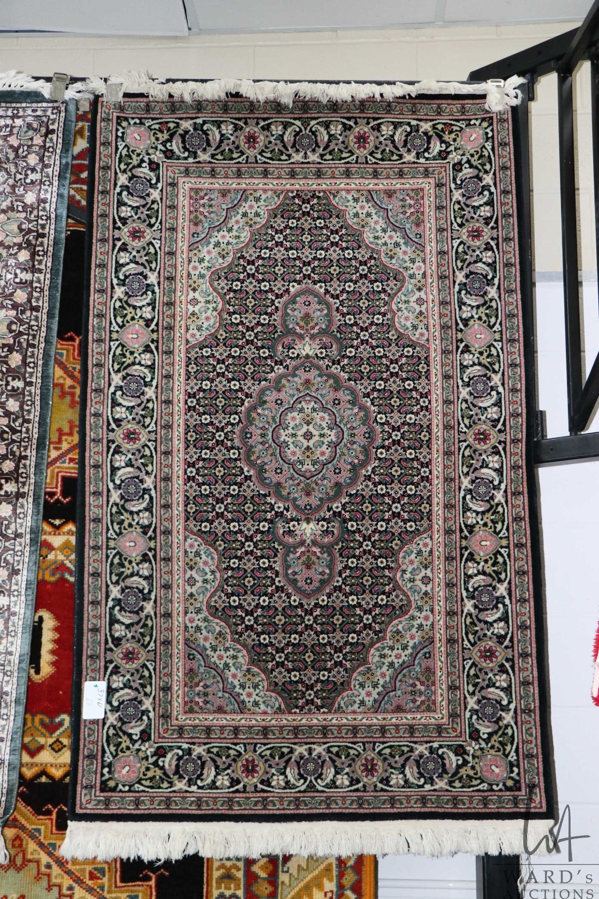Quality fine weave wool area carpet with center medallion and delicately detailed floral design in colours of green, blue, taupe etc. 37" X 61"