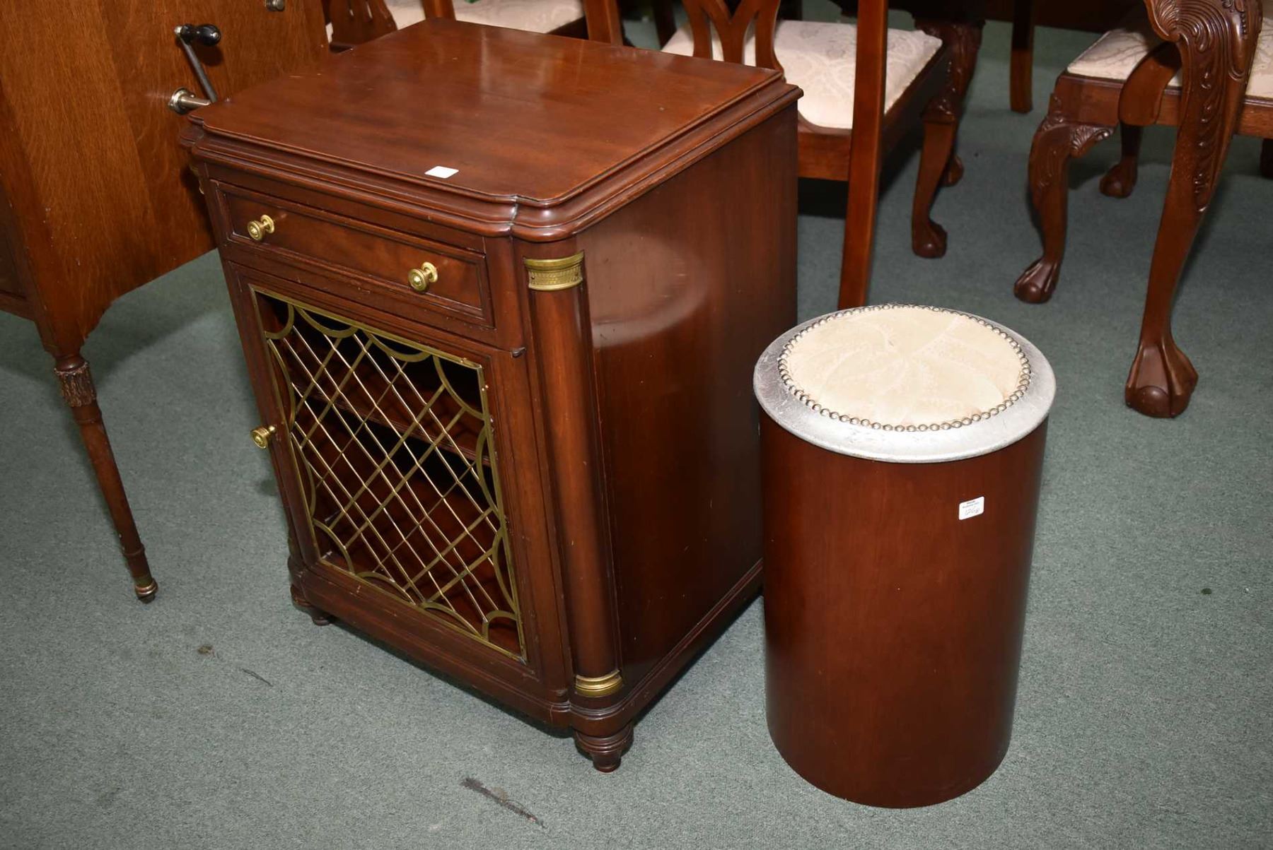 Quality mid 20th century night table with single drawer and brass centered door and a modern drum style stool