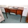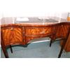 Quality modern replica of a George III Sheraton mahogany desk with ebony inlay and serpentine front, includes some original documentation and key, made by Theodore Alexander, 32" H X 42" W X 22" D