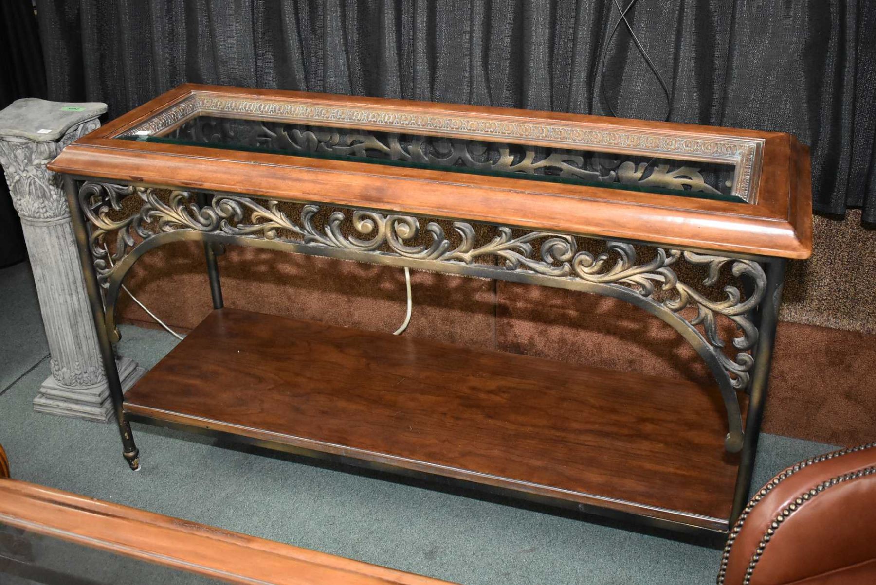 Quality semi-contemporary wood, metal and glass console table 55" wide