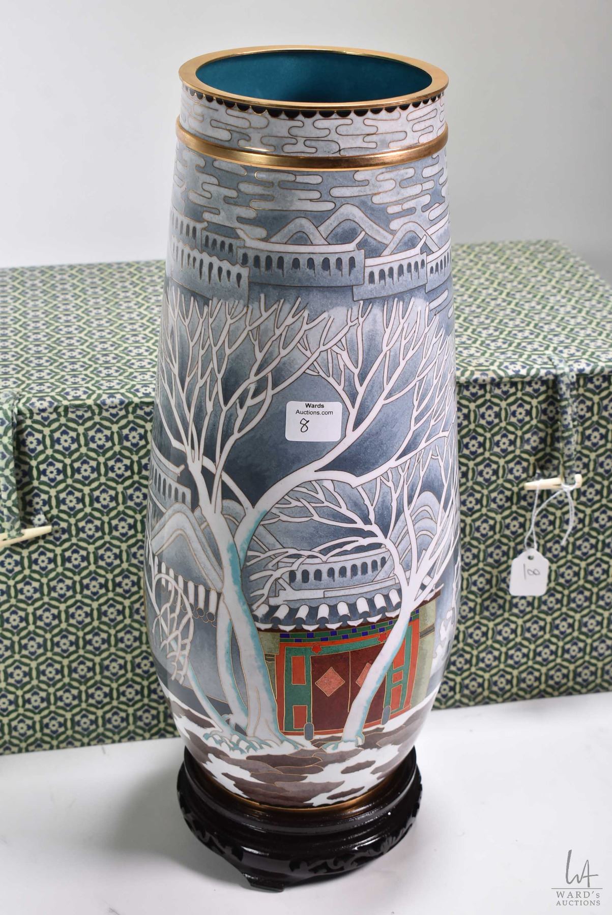Quality winter trees and building motif cloisonne vase 15" in height with wooden plinth and presentation box