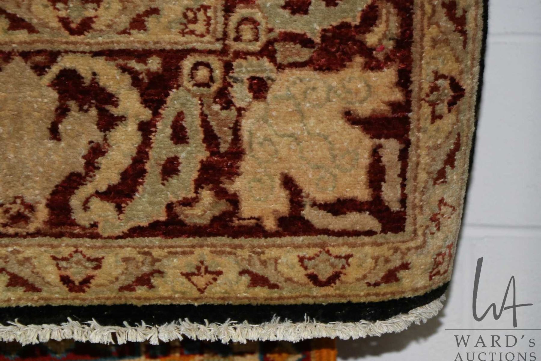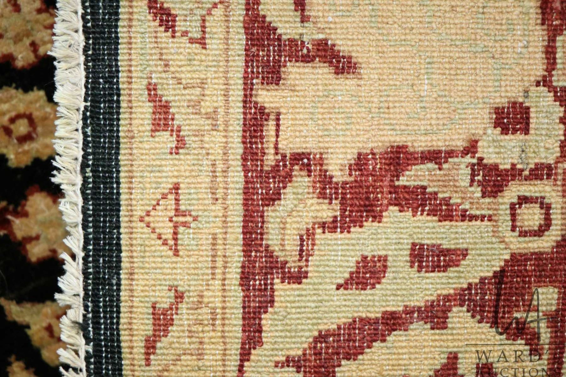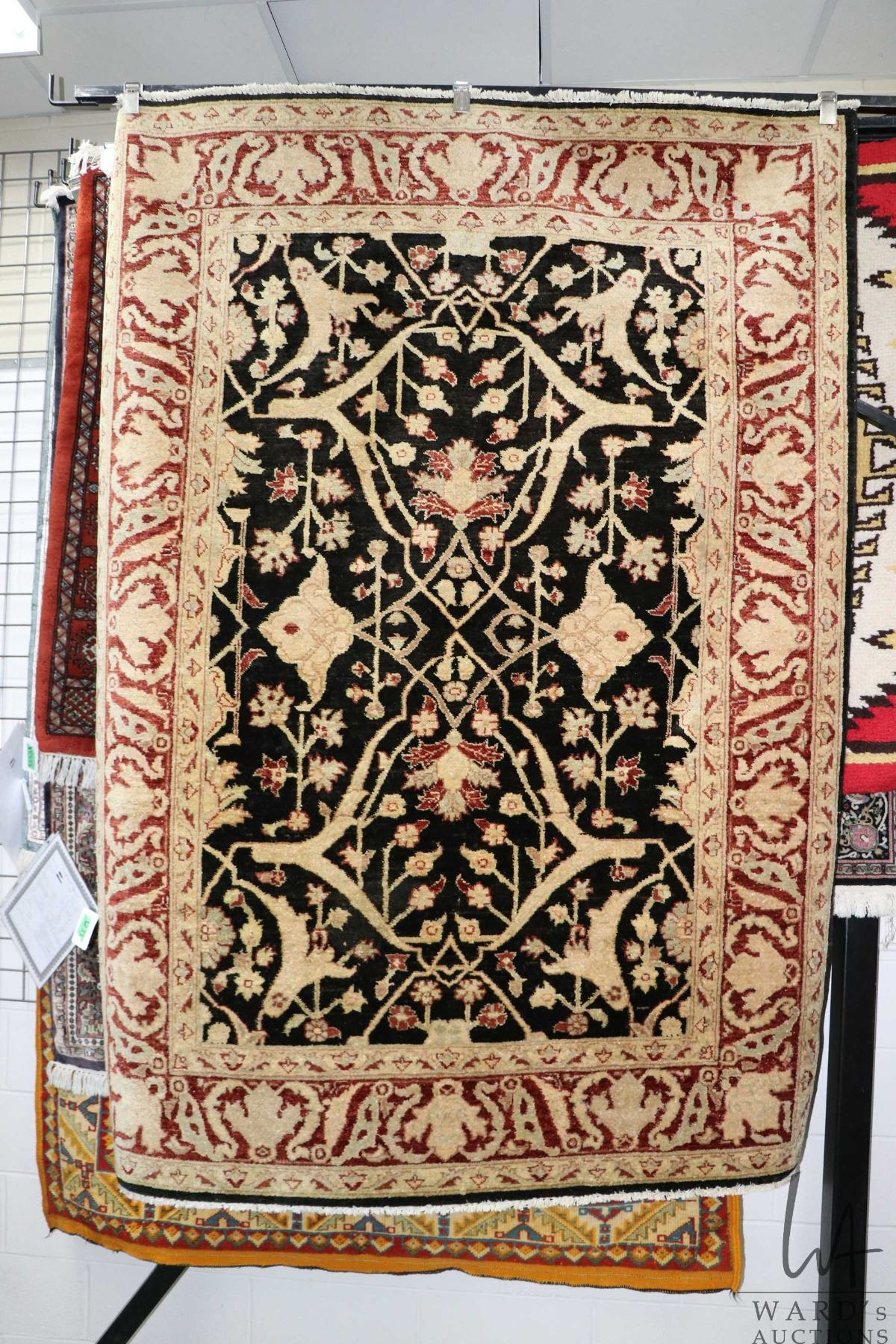 Quality wool area carpet with black background, deep taupe and brick highlights, 59" X 34"