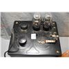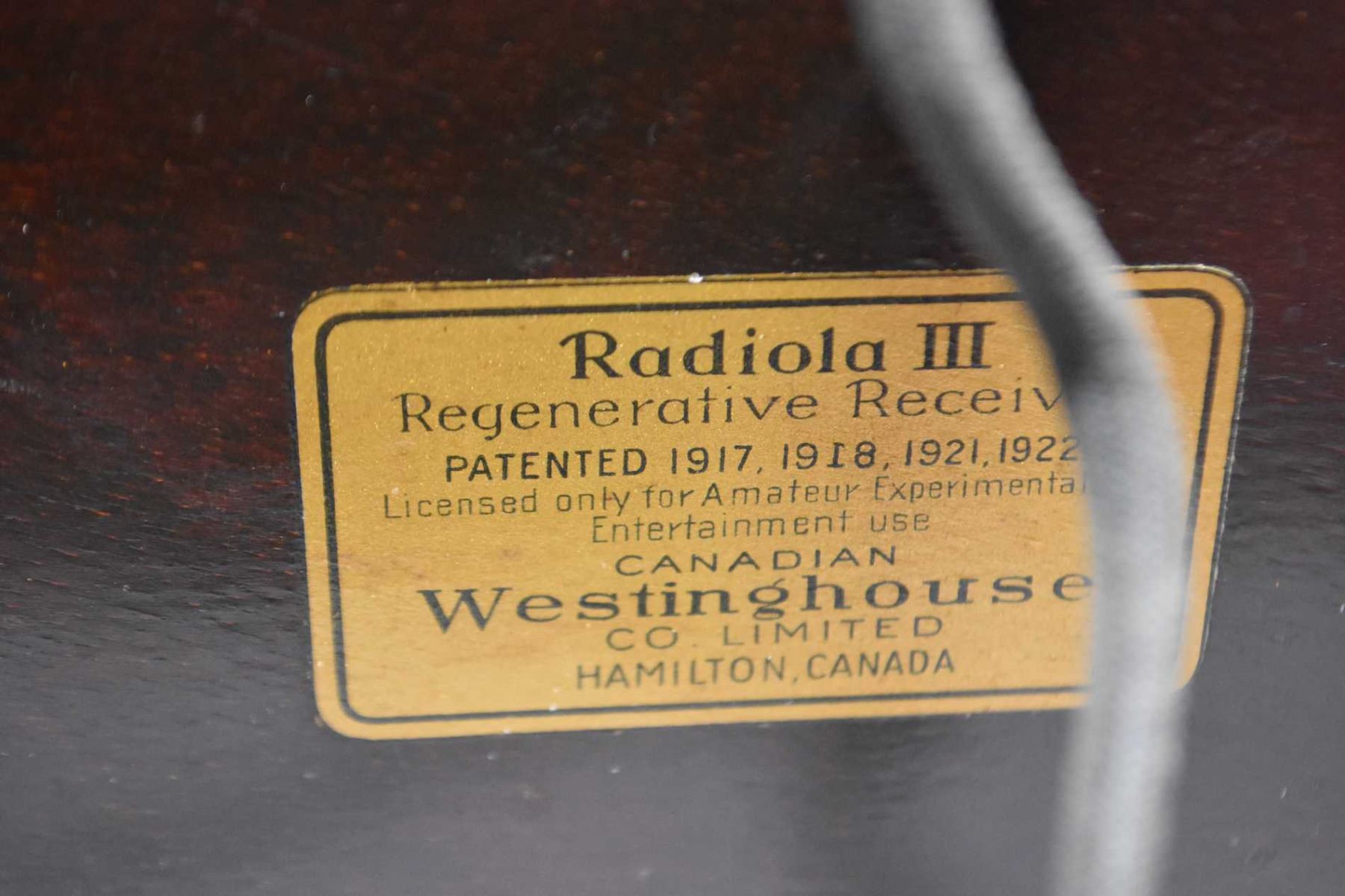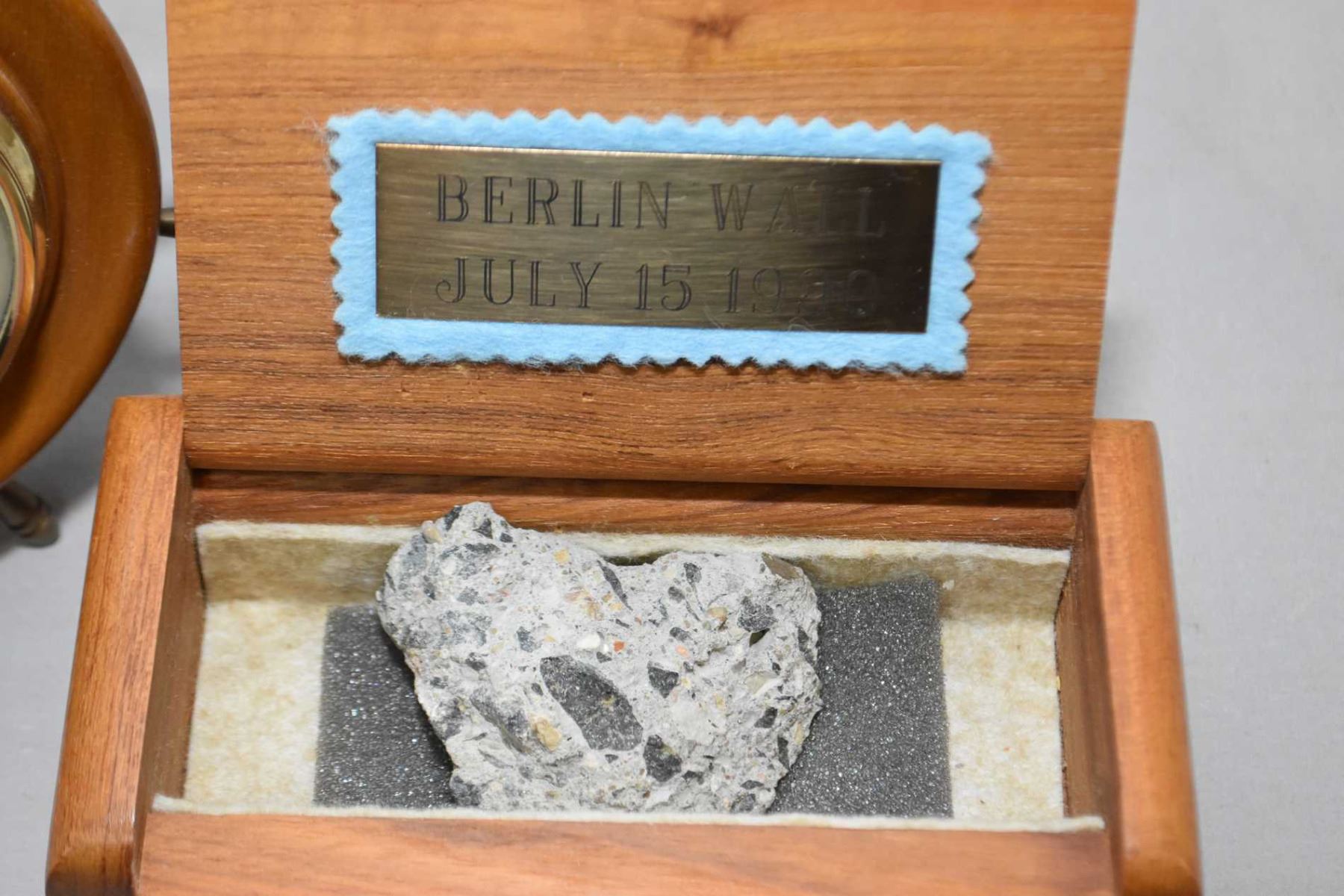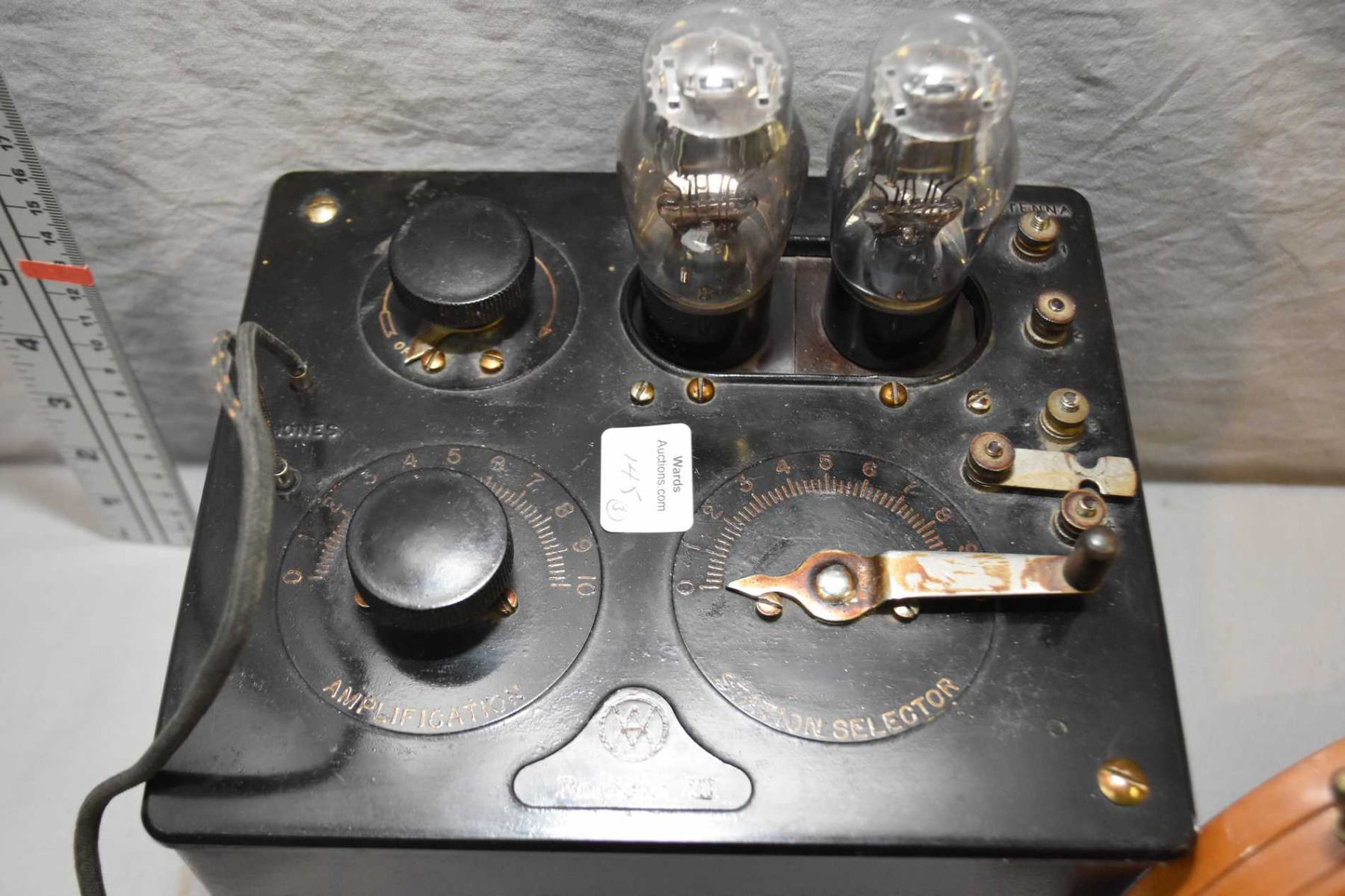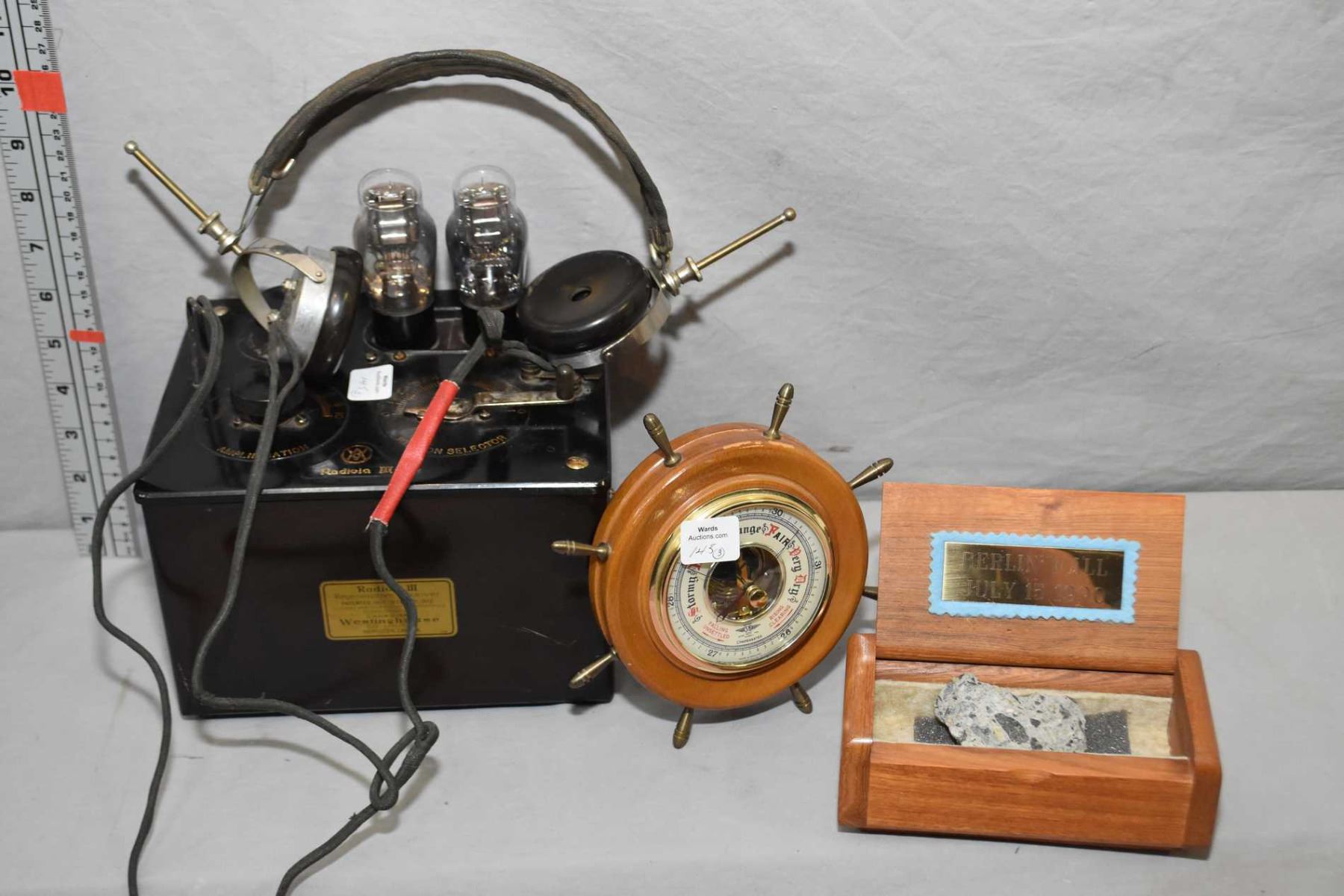 Radiola III Regenerative Receiver with a set of "Radar O'Reilly" Brands headphones, plus a wooden box containing a piece of the Berlin wall and a small wooden barometer