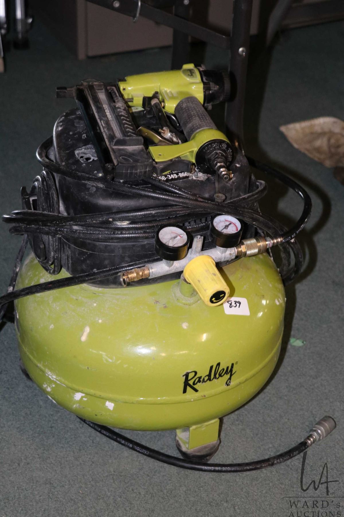 Radley 150 psi compressor with six gallon tank and 2.6 per minute at 90 psi plus a Radley pin nailer, hose and air nozzle, working at time of cataloguing