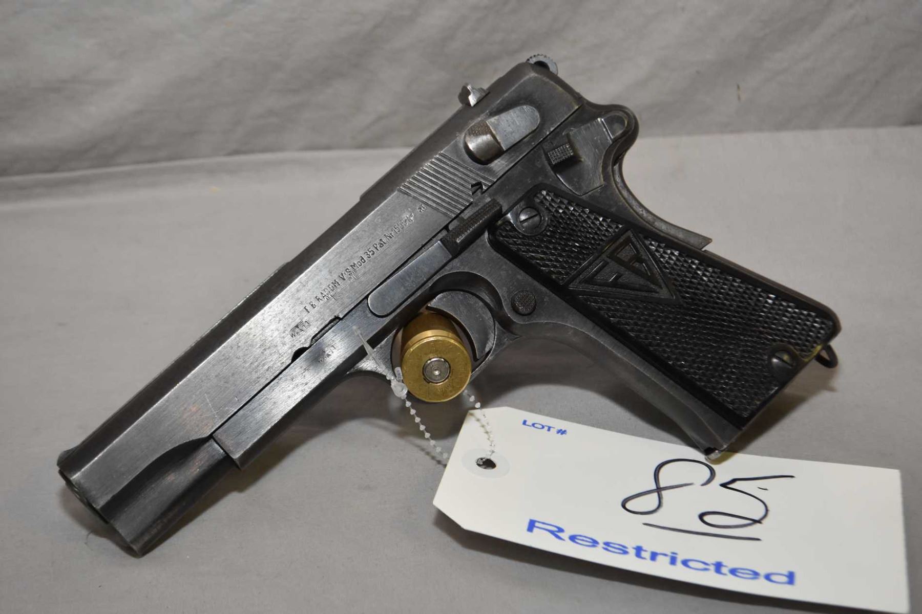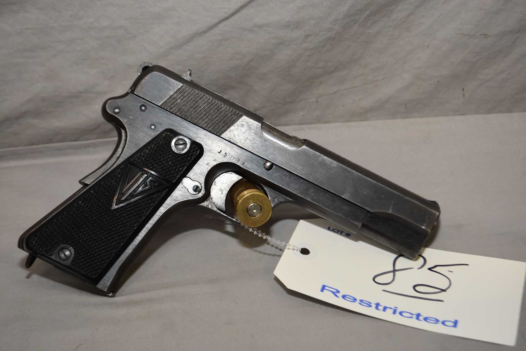 Radom ( Polish State Arsenal ) Model VIS 35 .9 MM Luger Cal 8 Shot Semi Auto Pistol w/ 121 mm bbl [ German Nazi Accepted with WaA - 77 Acceptance, early production three lever, Circa 1941 - 1942, blue finish starting to fade, checkered black grips, few marks to metal ] Ser # J5027 Restricted Handgun Cert # 12623641 FRT # 21336 - 1