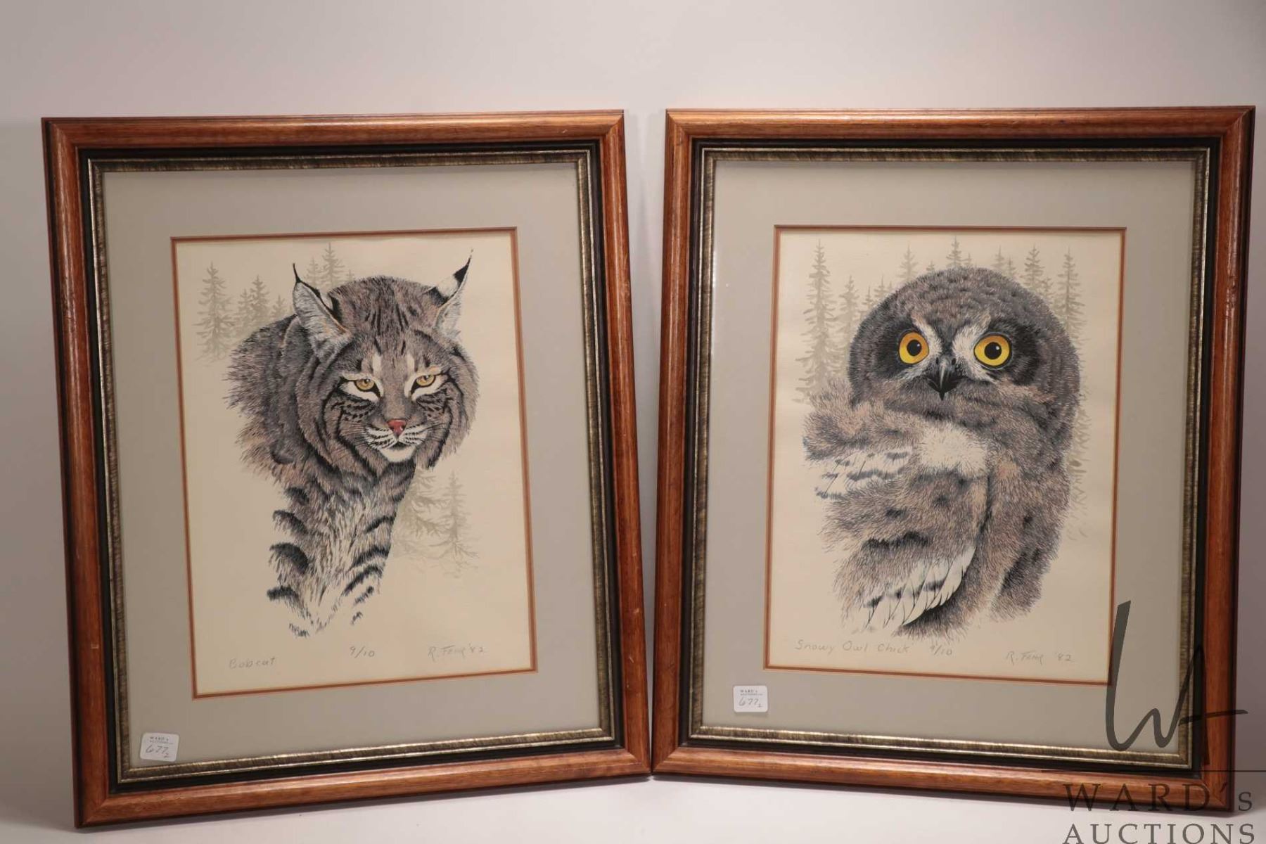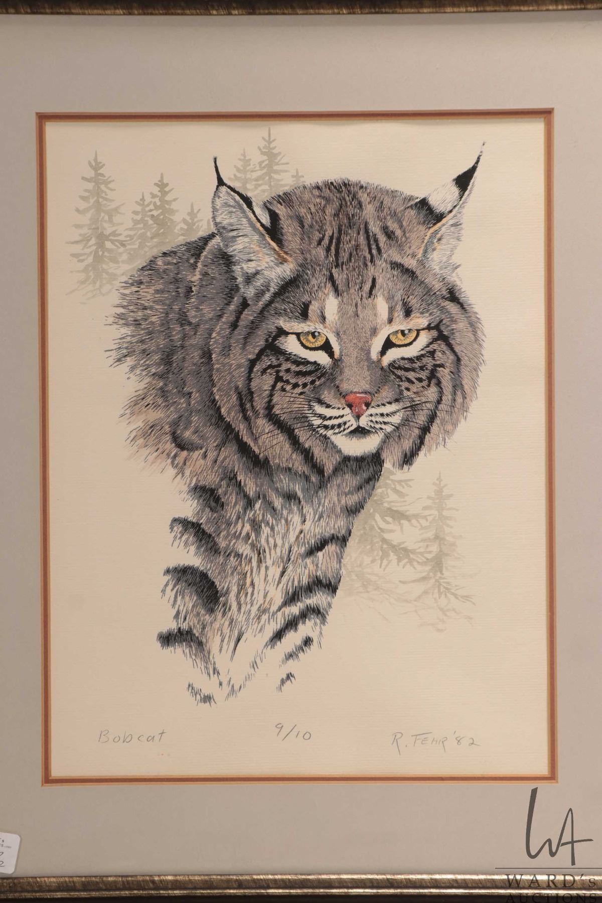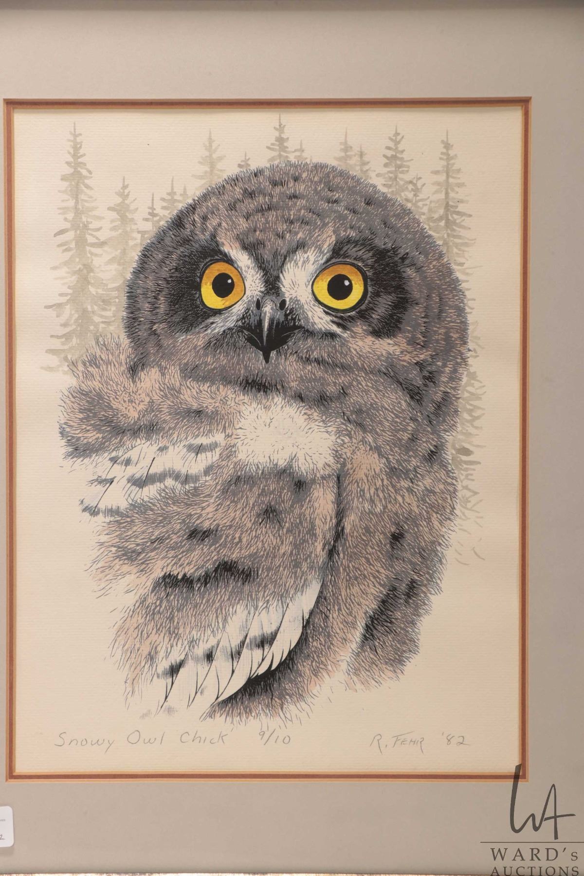 Randy Fehr, two framed limited edition prints including "Snowy Owl Chick" 9/10 and "Bobcat " 9/10, both pencil signed by artist and dated 1982. Each overall dimensions including frames 19 1/2" X 16 1/2"