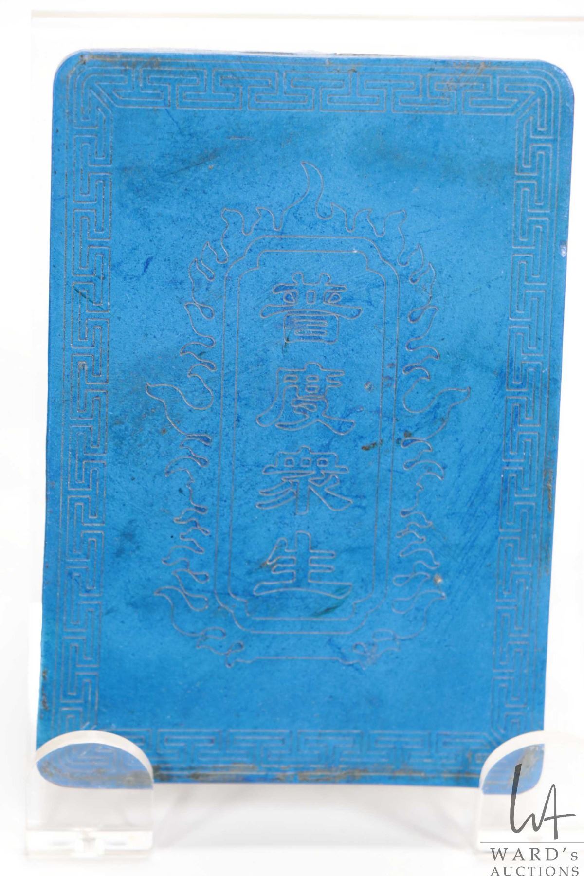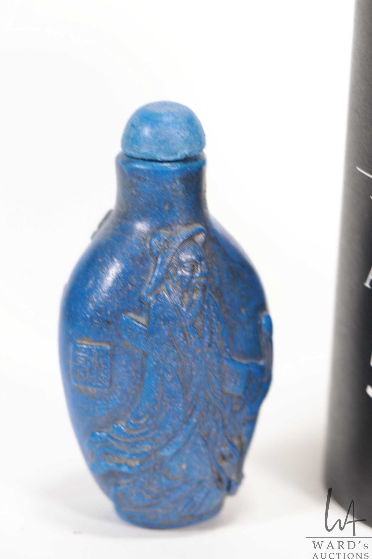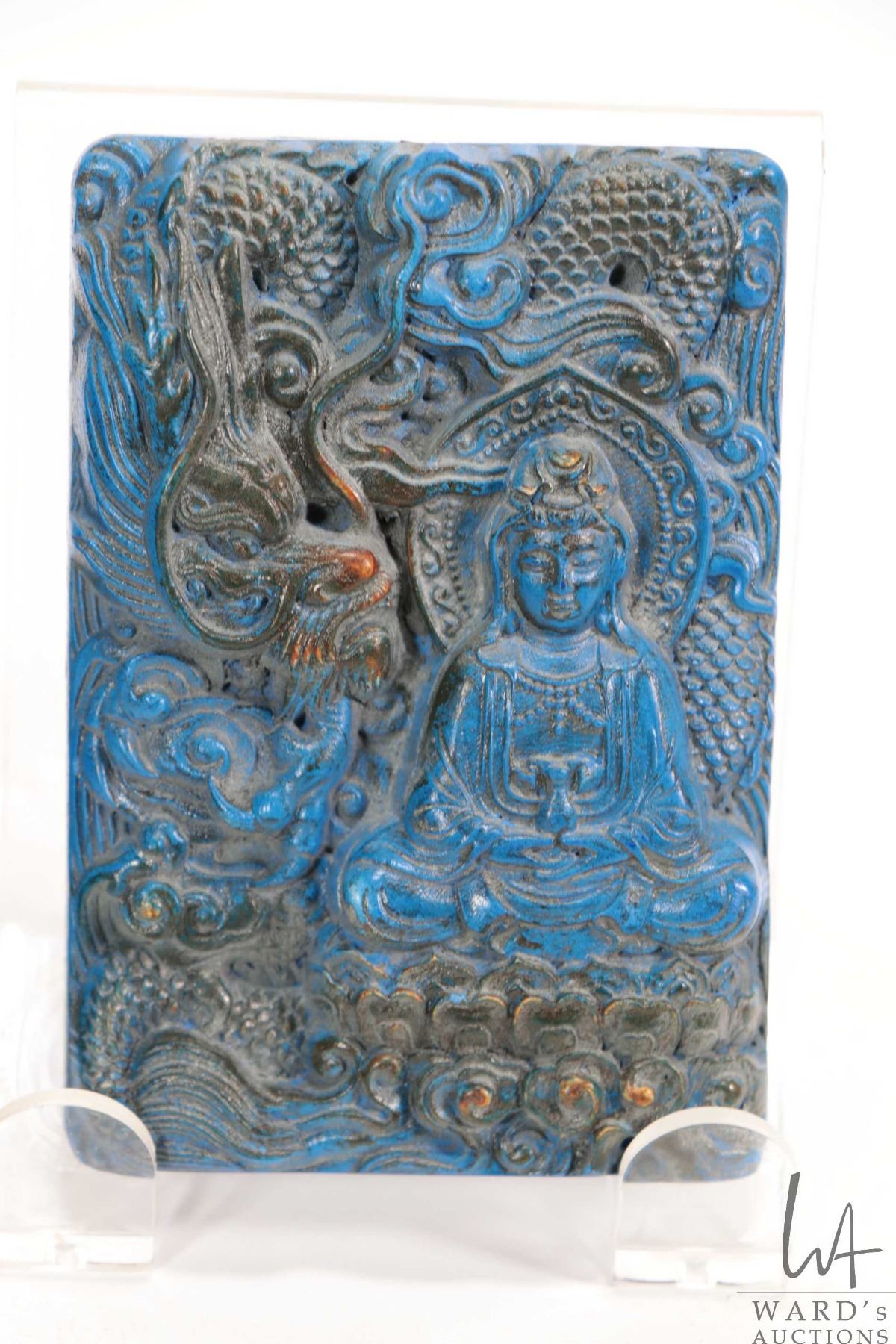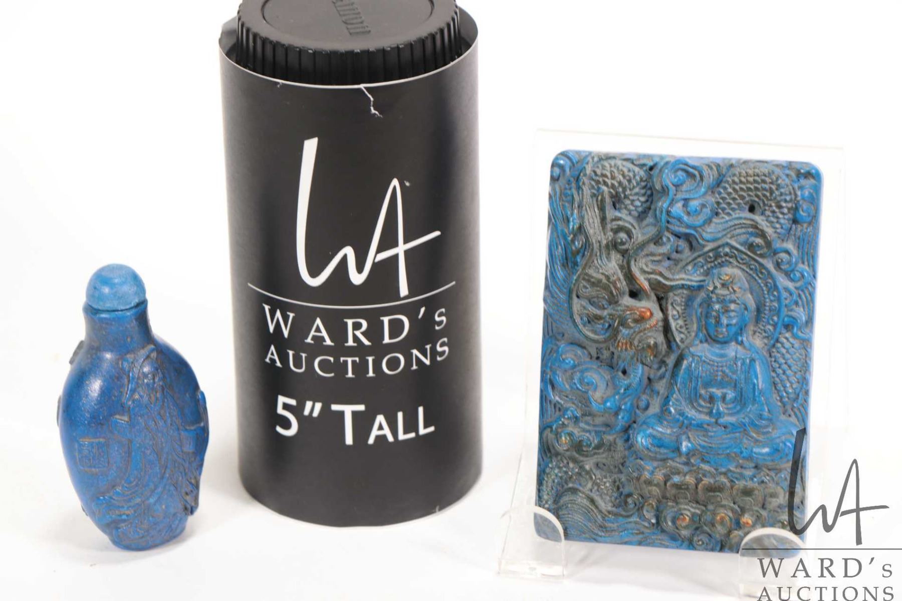 Rectangular lapis style Buddha blessing plaque 4" X 2 3/4", and a blue lapis style snuff bottle