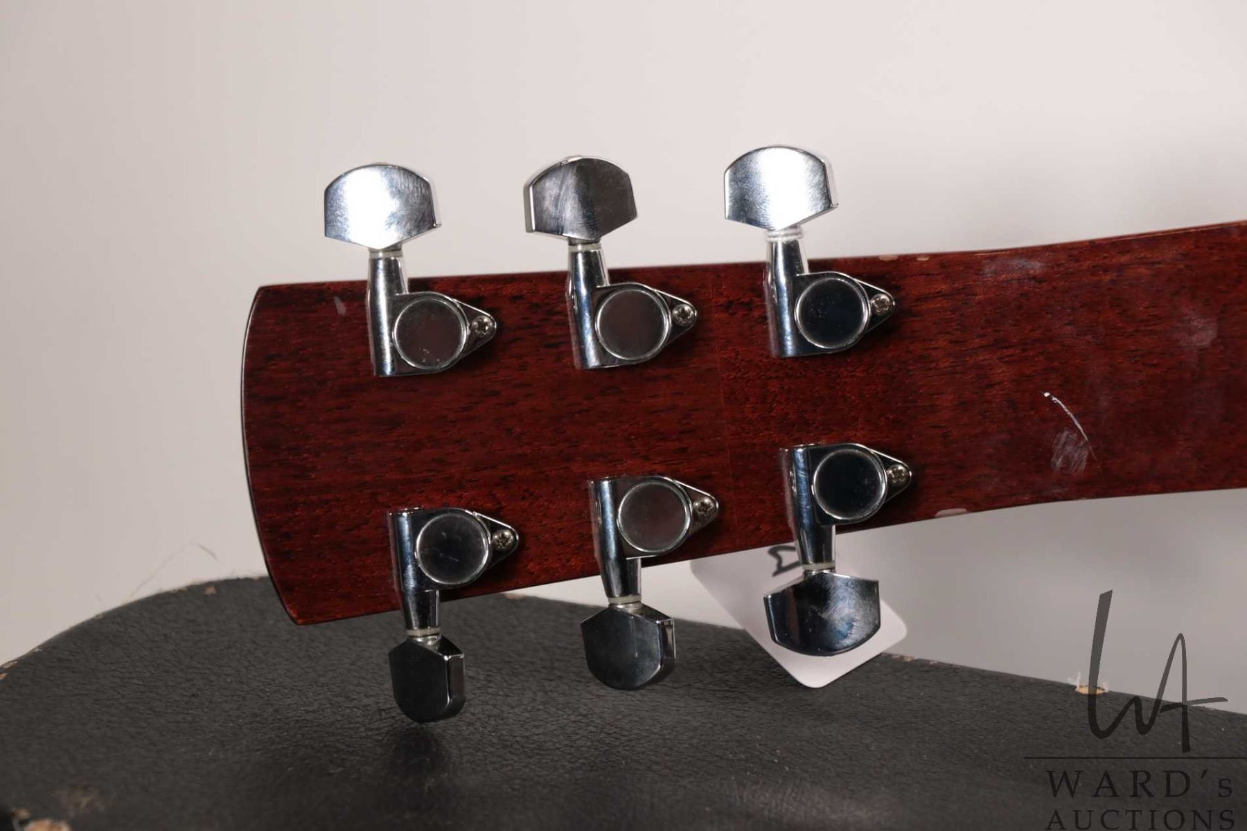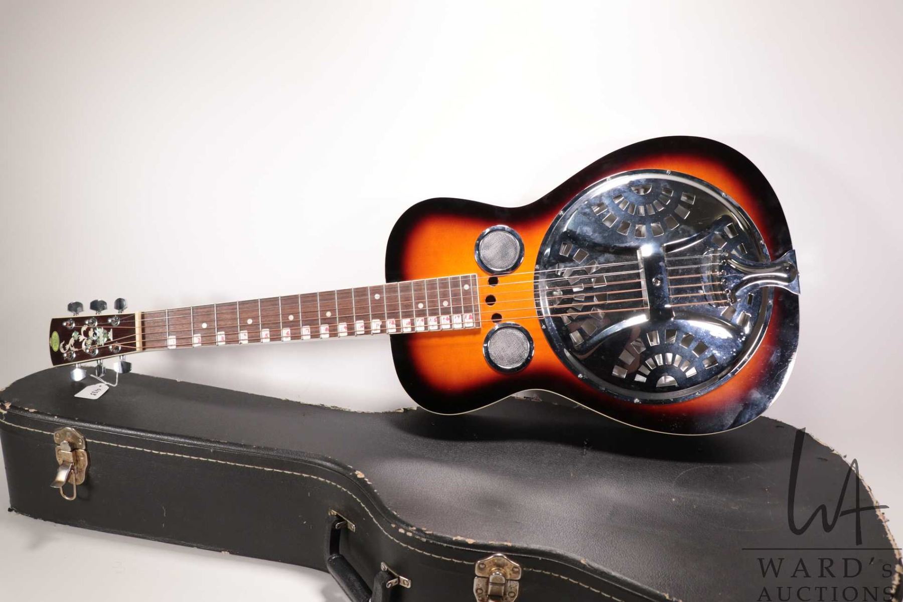 Regal lap top steel electric guitar. Sunburst top, ribbon grained mahogany back and heavy thick neck with harmonic resonance, chrome opening and Dobro style chrome metal. Includes well worn hard case