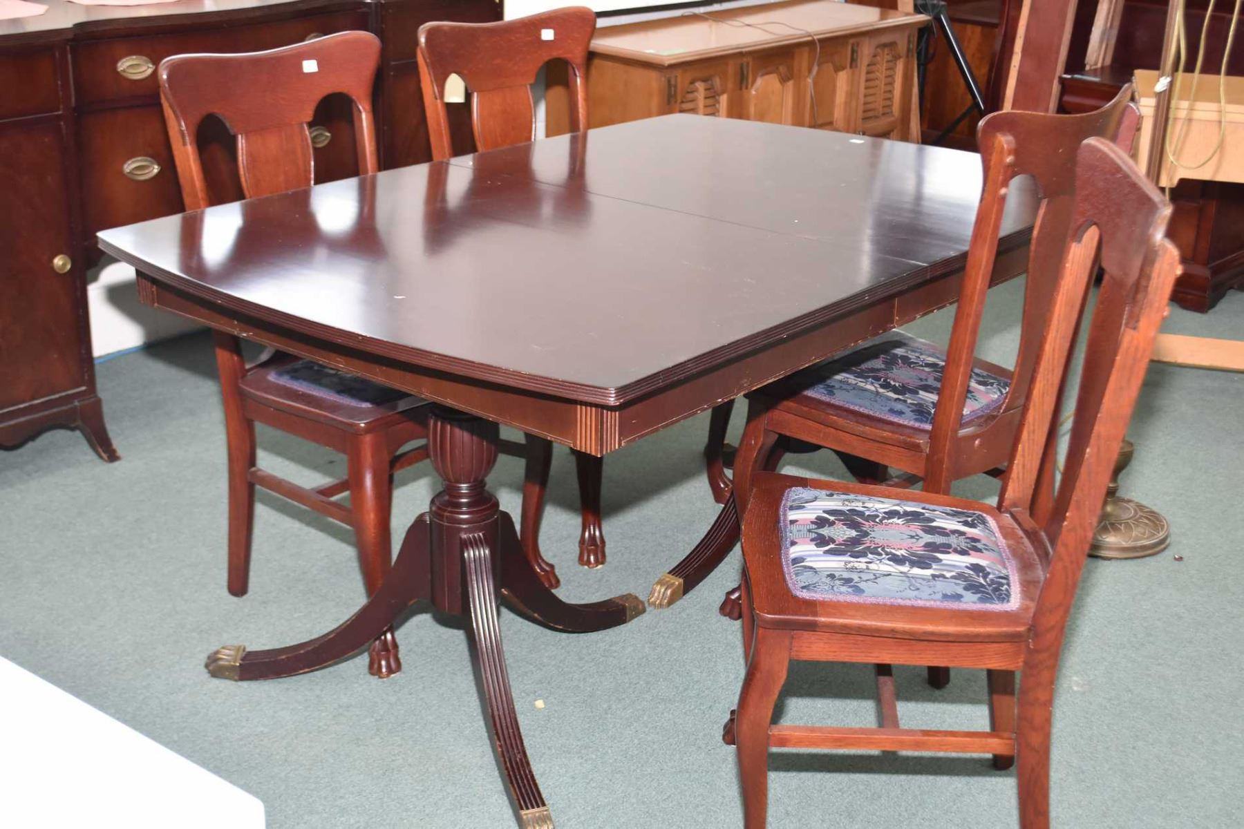 Regency double pedestal dining table with brass capped claw feet and set of four complementing dining chairs