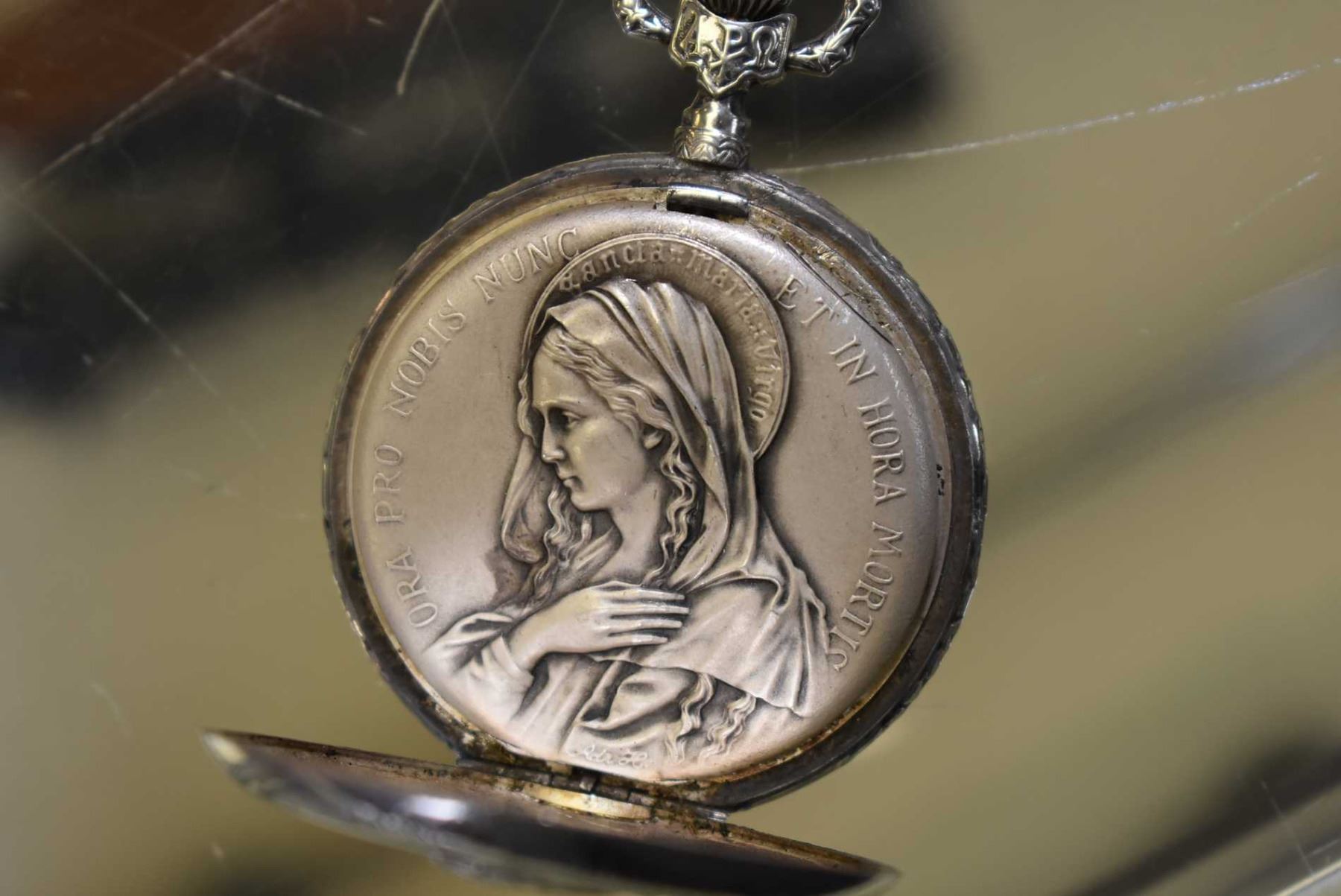 Religious themed pocket watch with 17 jewel Prema movement, not working at time of cataloguing