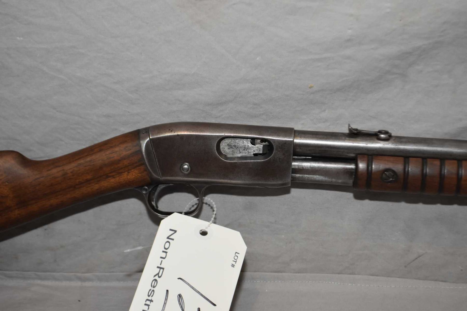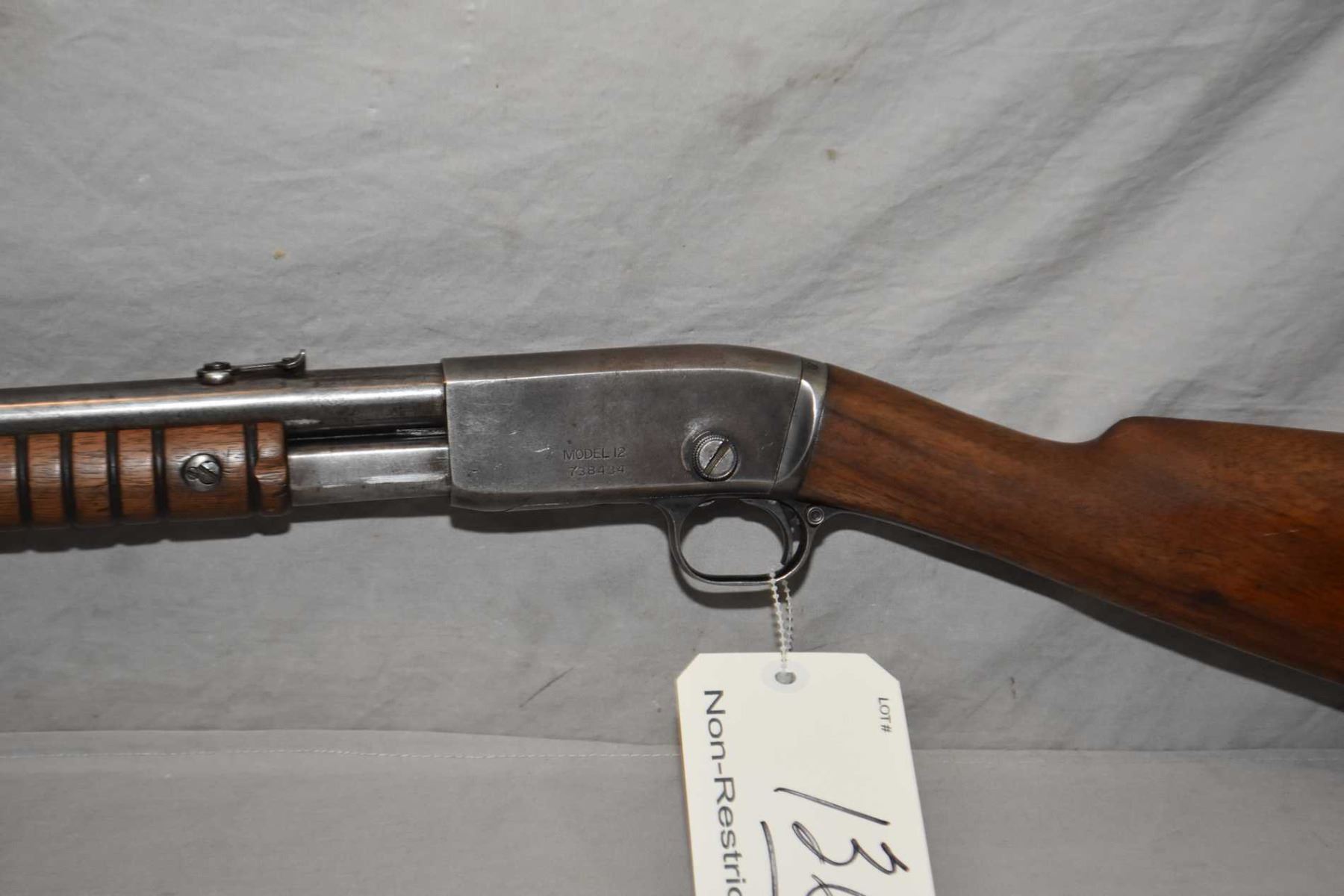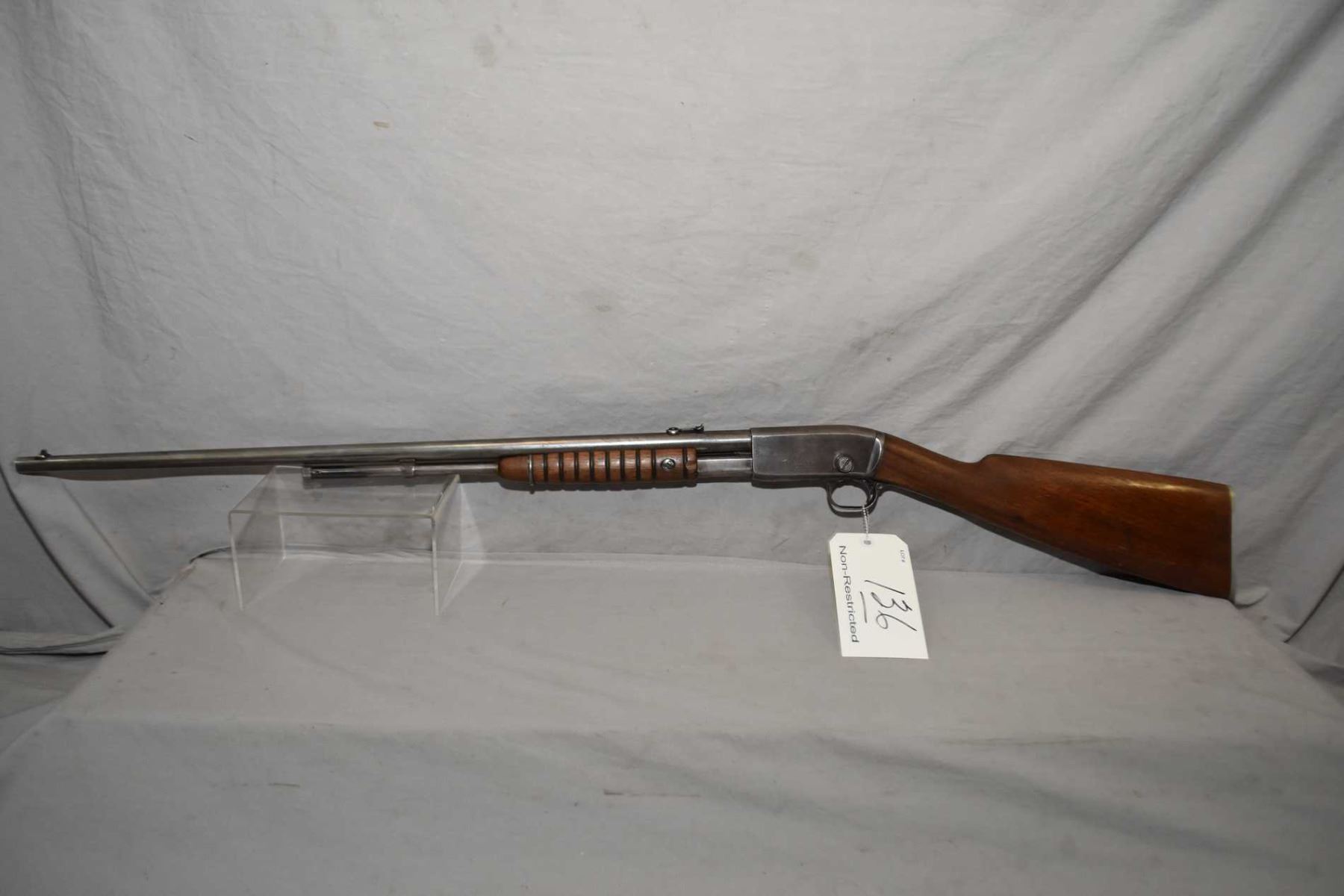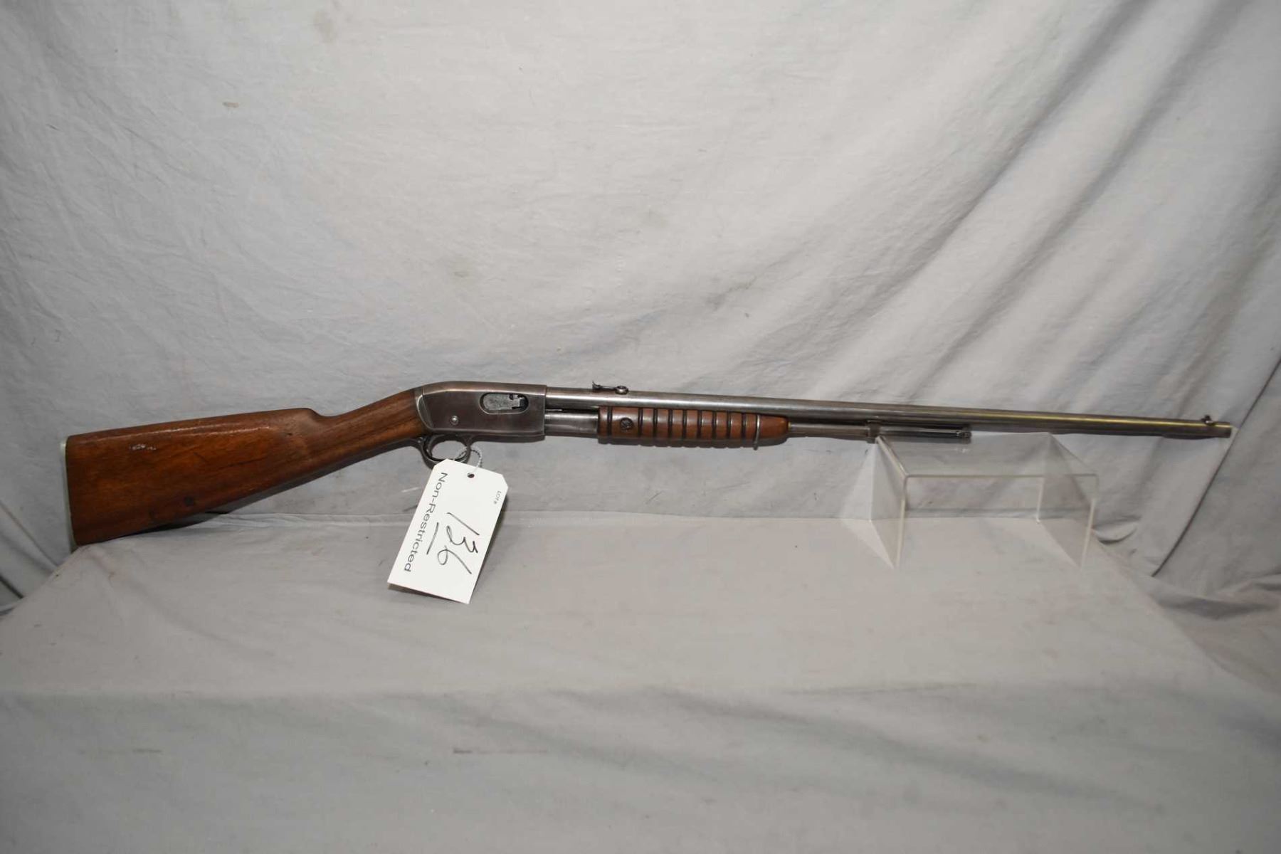 Remington Model 12 .22 LR Cal Tube Fed Pump Action Rifle w/ 25" bbl [ traces of blue in protected areas, faded to grey in most, barrel sights, straight stock w/ correct forend, note : metal band , metal butt plate, some marks and scratches to wood and metal ] Ser # 738434