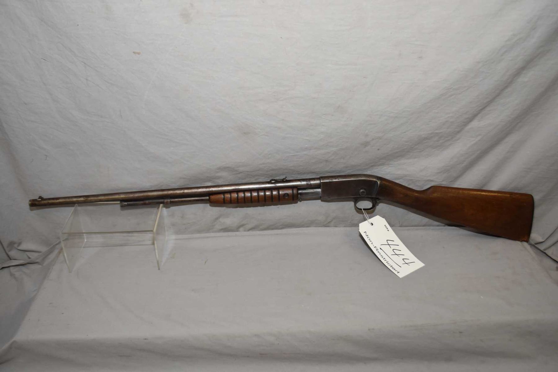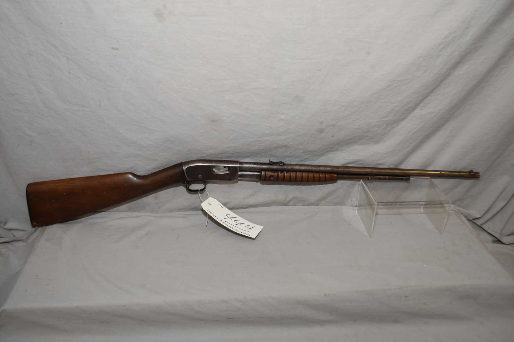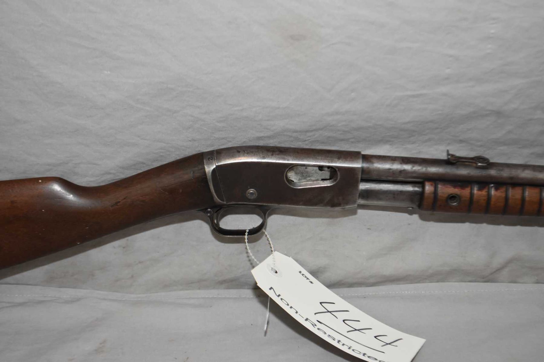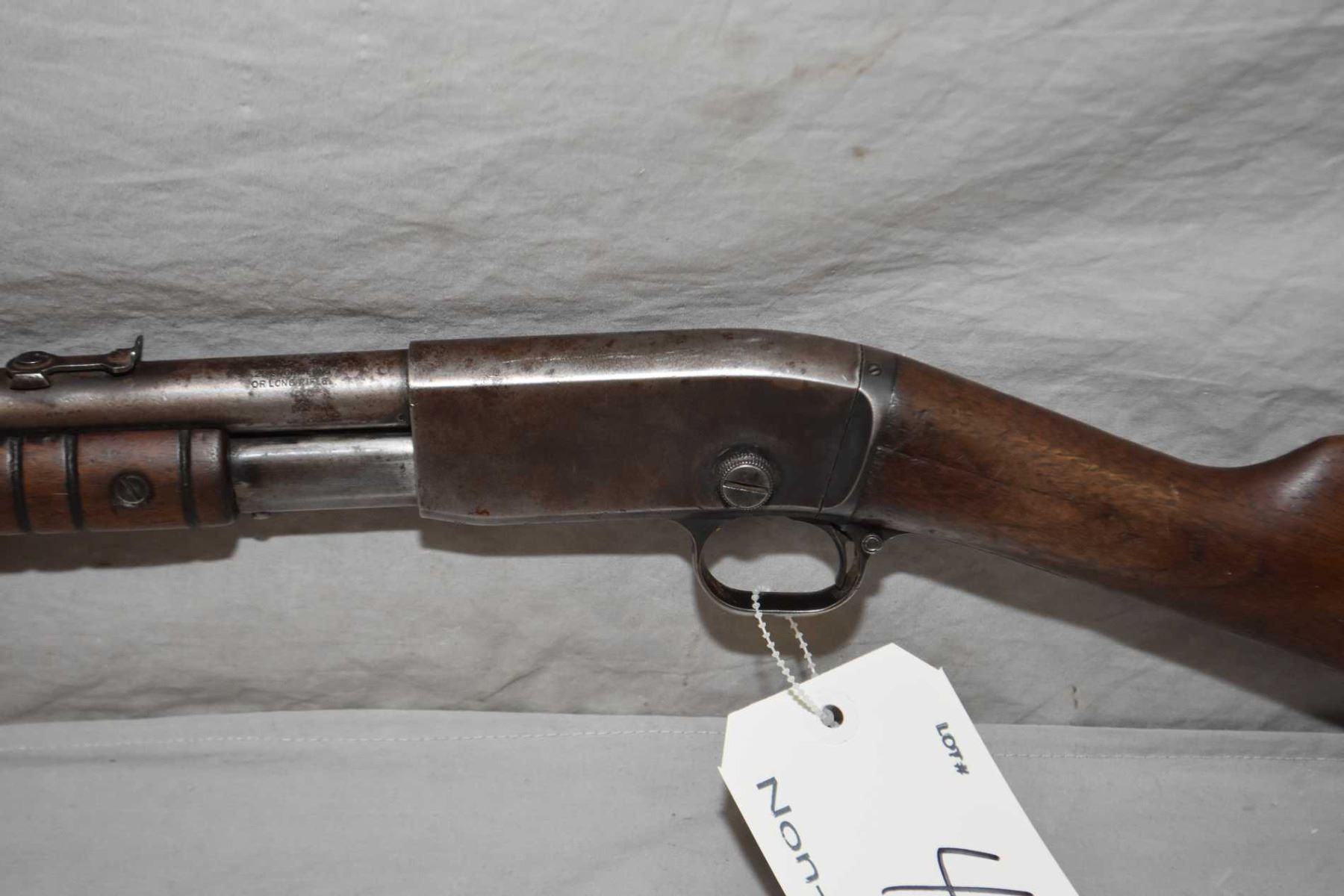 Remington Model 12 - A .22 LR Cal Tube Fed Pump Action Rifle w/ 22" bbl [ fading patchy blue turning brown, with various marks and scratches, barrel sights, good grooved forend, butt stock cracked behind receiver, and also gouges at toe including the butt plate, various marks and scratches to the wood ] Ser # 442288
