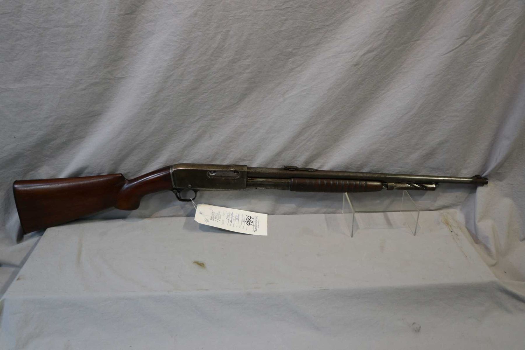 Remington Model 14 .32 Rem Cal Pump Action Tube Fed Rifle w/ 22" bb l [ patchy blue finish, faded to grey in most areas, some surface rust, barrel sights, fair original forewood, butt stock appears to be replaced, various marks and scratches to wood and metal ] Ser # C49814