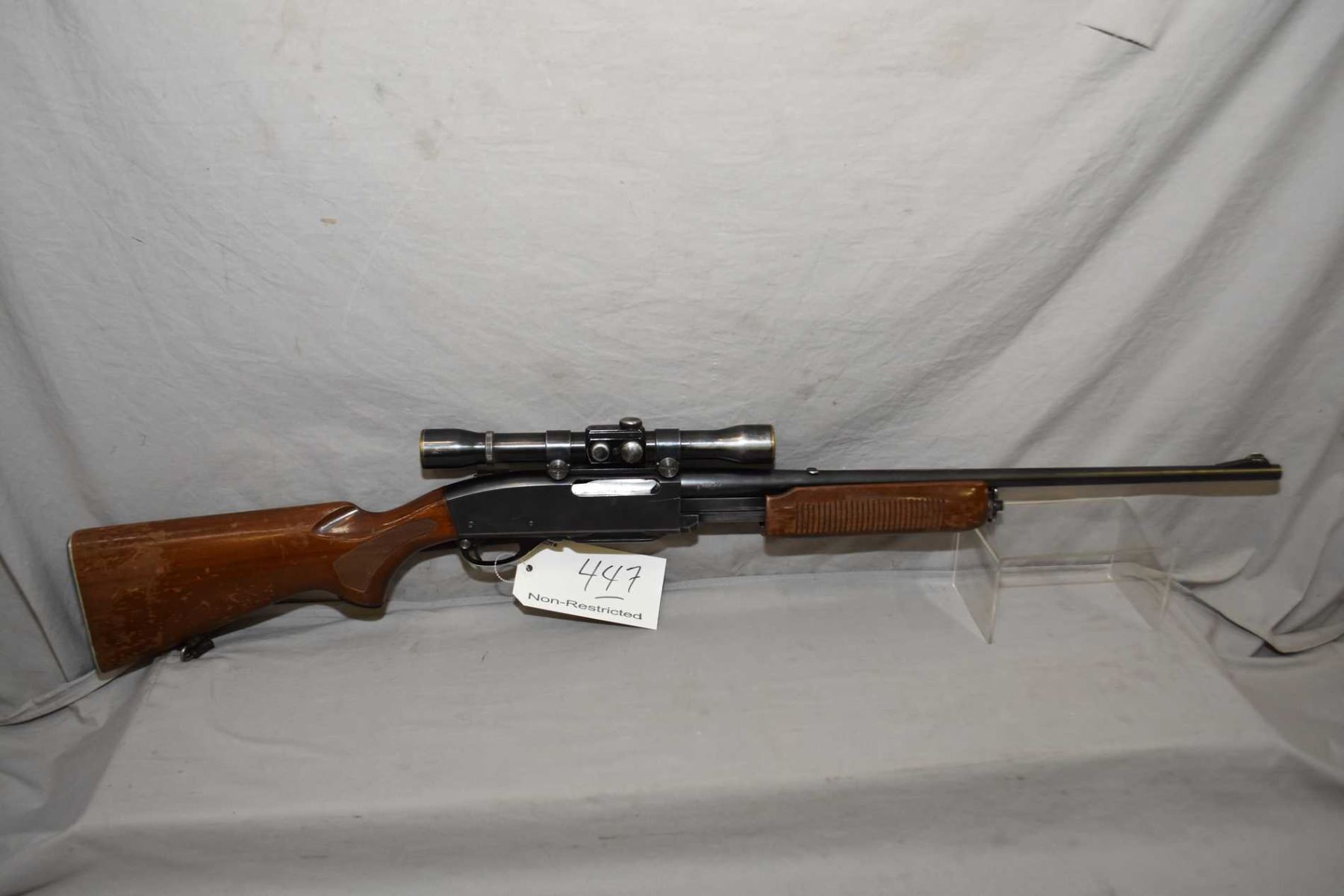 Remington Model 760 Gamemaster .30 - 06 Sprg Cal Mag Fed Pump Action Rifle w/ 22" bbl [ blued finish starting to fade more in carry areas, back sight removed and wedge installed, also fitted with Weaver KV Scope with Weaver rings and base, checkered pistol grip stock with grooved forewood, flaking varnish with various marks and scratches, w/ leather sling, Remington metal butt plate ] Ser # 25185