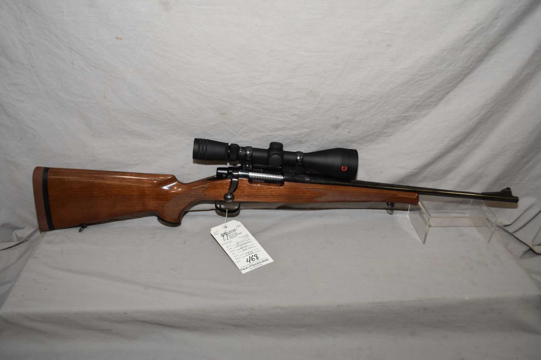 Remington Model Seven .308 Win Cal Bolt Action Carbine w/ 18 1/2" bbl [ blued finish starting to fade, back barrel sight removed, fitted w/ Redfield 3 x 9 x 50 Scope w/ cover, Burris rings and mounts, gloss finished checkered pistol grip stock with Remington grip cap, Decelerator recoil pad, sling swivels, few slight marks to wood and metal ] Ser # 7604078