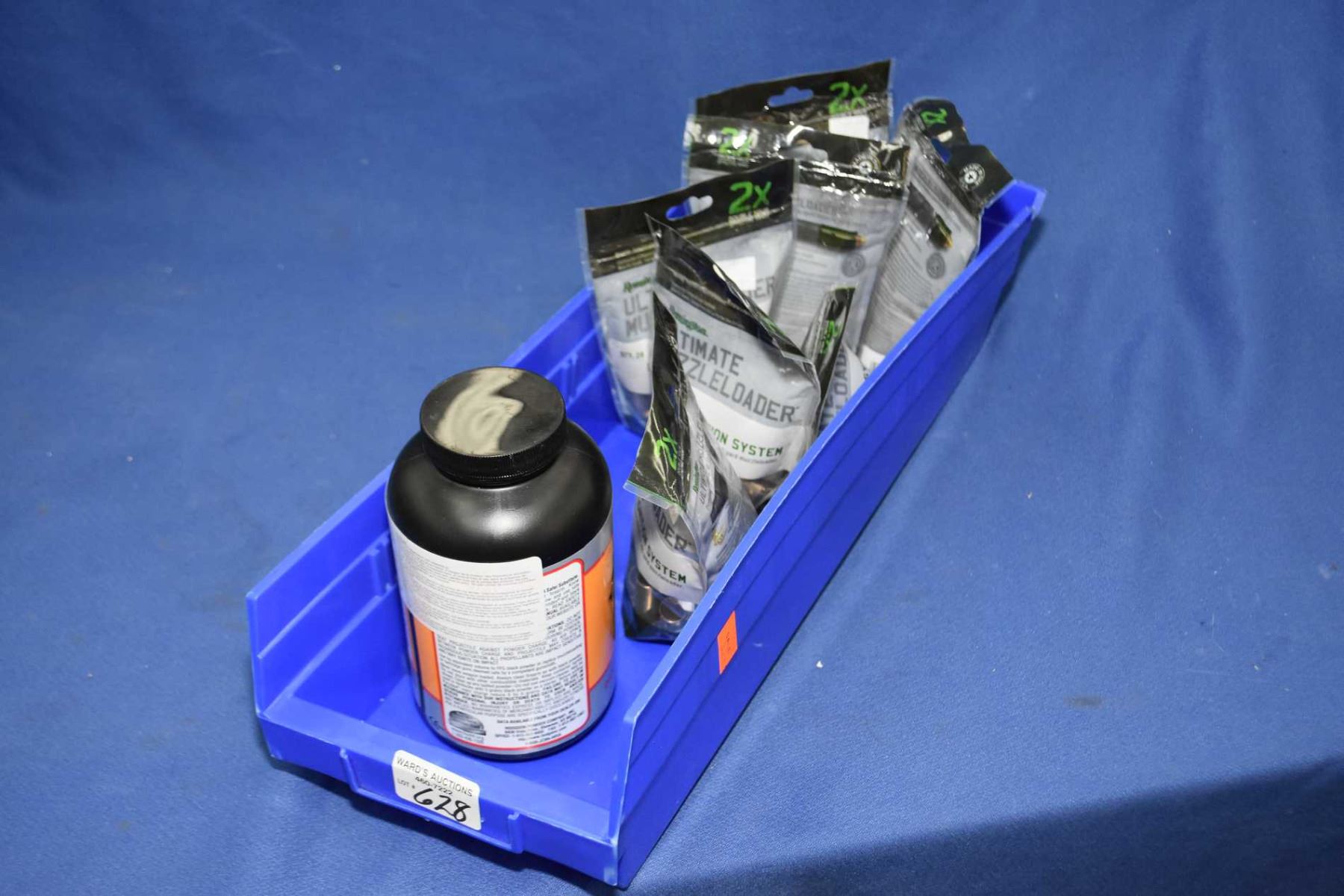 Remington muzzle loader equipments Seven new in package bags of Remington "Ultimate Muzzle Loader" primed cartridges and a container of muzzle loading propellant