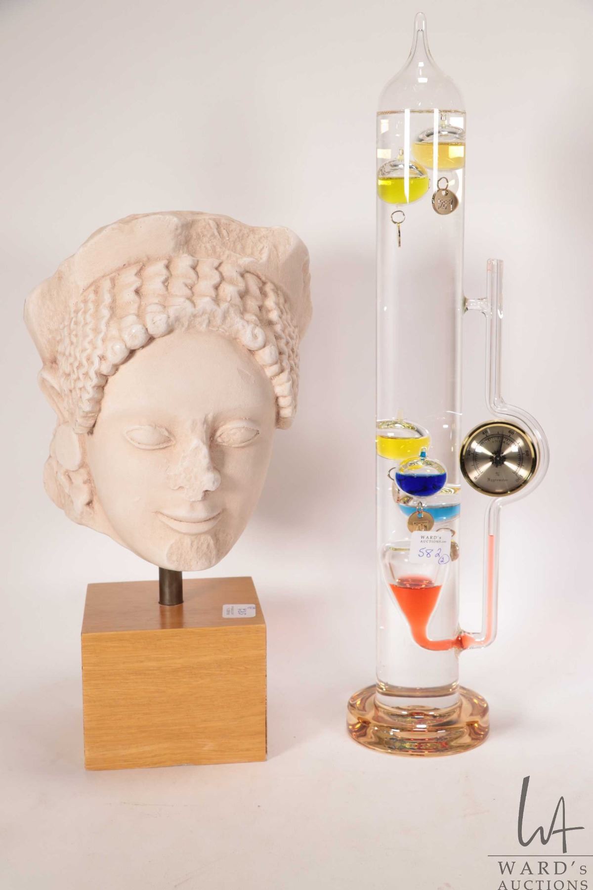 Replica Archaic Greek Kore statue 12" in height and a glass barometer