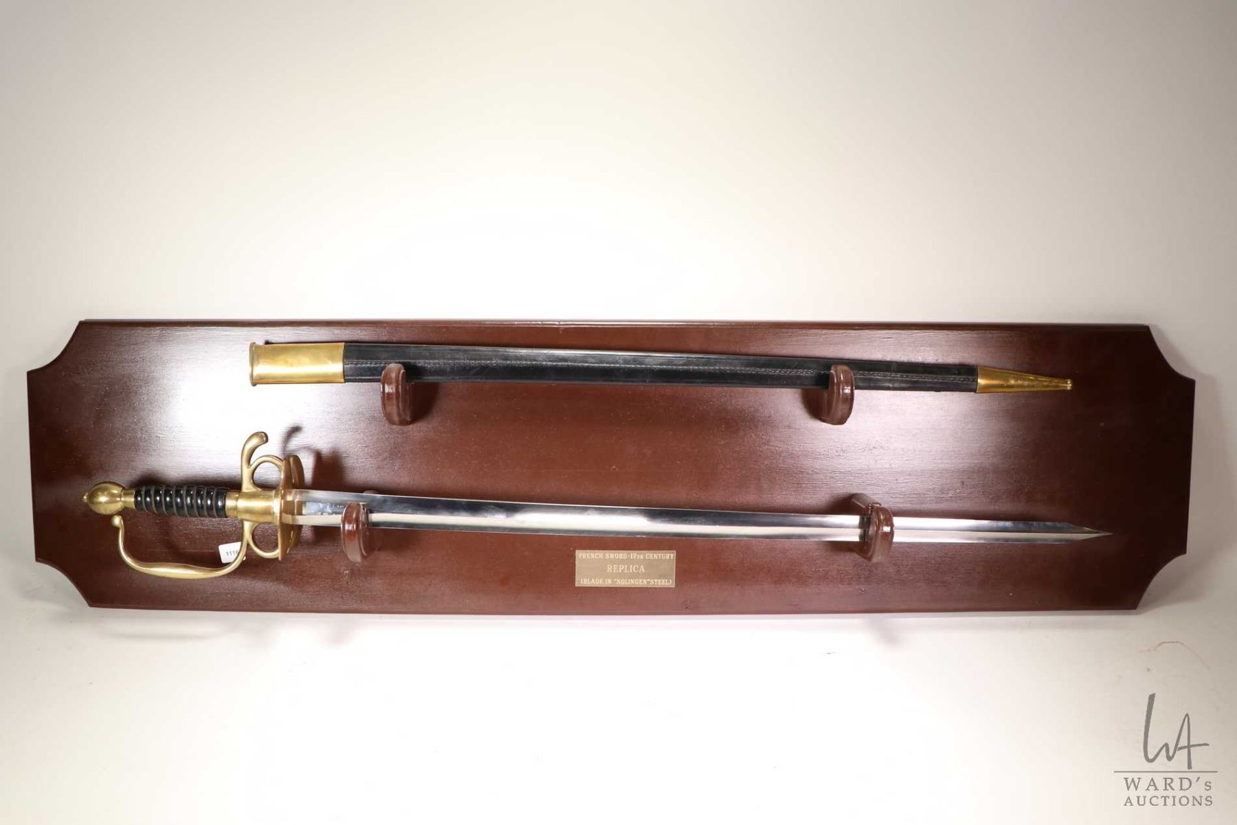 Replica French 17th sword, blade marked Solingen, with sheath on wall mounting plague