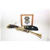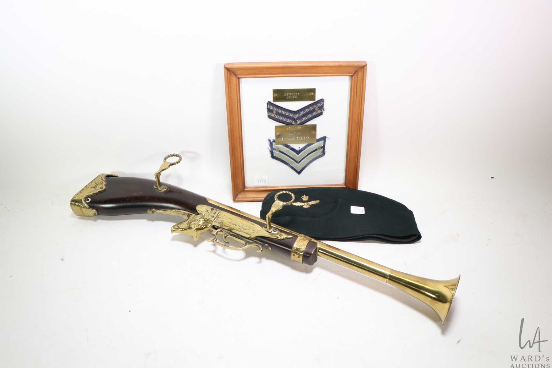 Replica blunder bust and a military cap and a framed set of sew on military patches