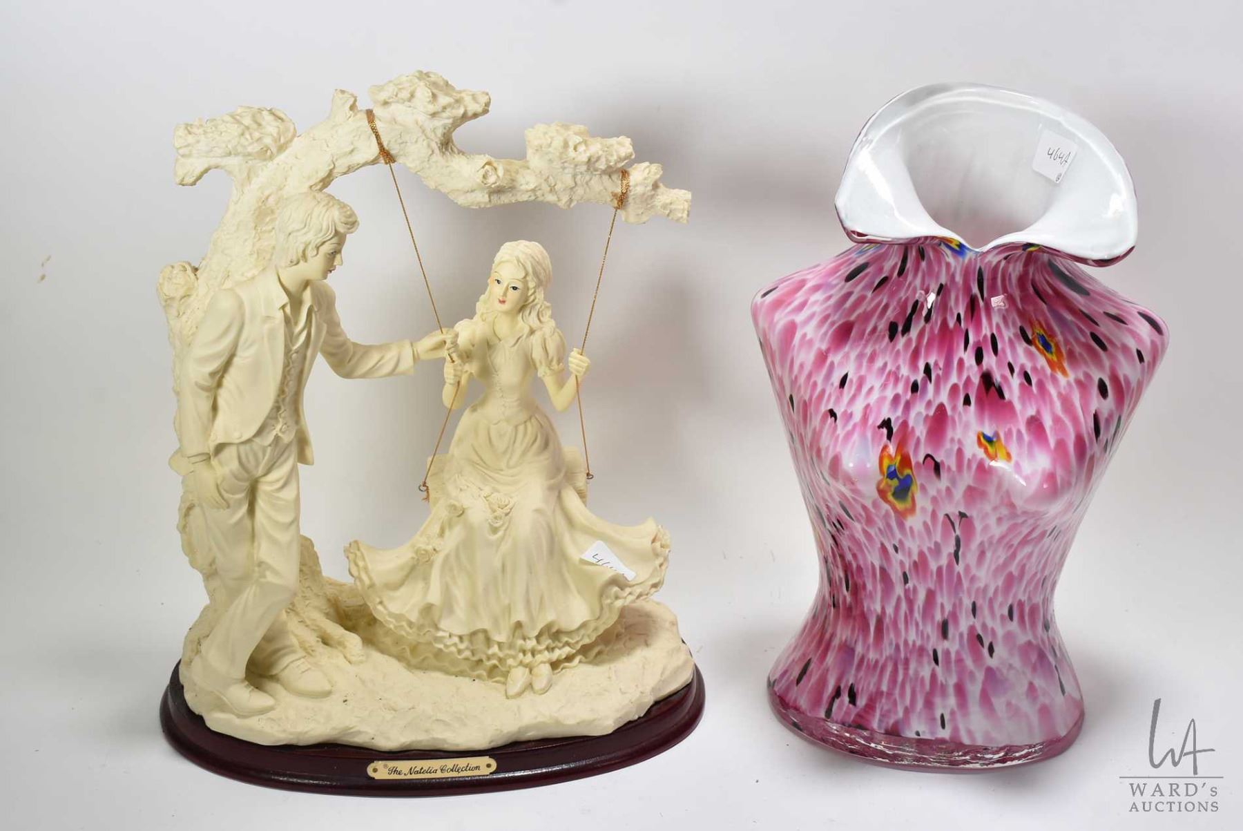 Resin lovestory sculpture from the Natelia Collectible and a mottled glass female torso vase 12" in height