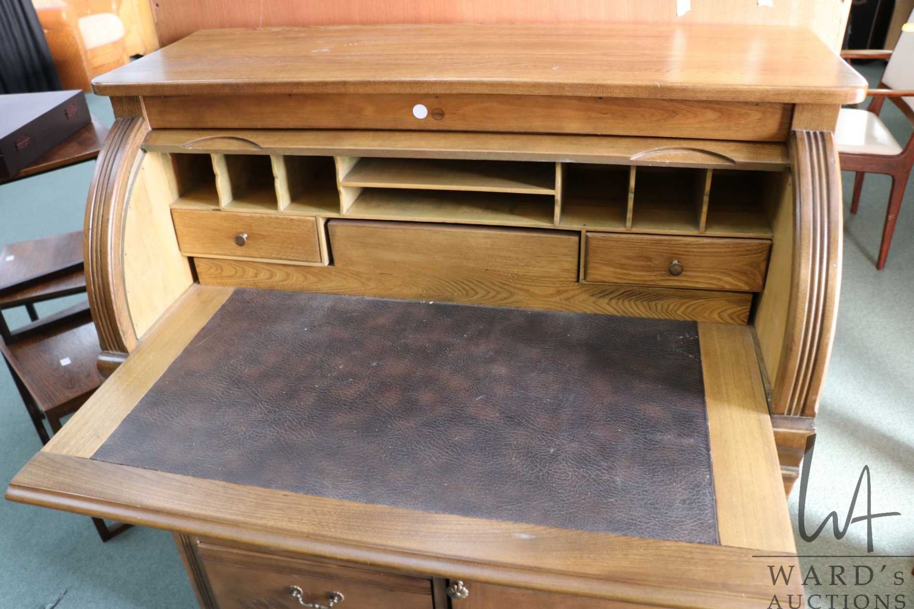 Restored antique roll top desk with leather insert pull out writing surface, fitted interior and storage drawers, 43" H X 41" W X 21" D