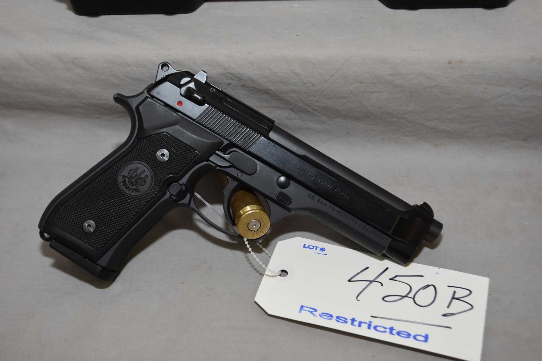 Restricted - Beretta Model M 9 . 9 MM Luger Cal 10 Shot Semi Auto Pistol w/ 125 mm bbl [ appears v - good, blued finish, white dot sight, few marks to metal, black checkered Beretta grips, with foam lined Caseguard pistol case ] Ser # M9117813 Restricted Handgun Cert # 18652761 FRT # 25254 - 1