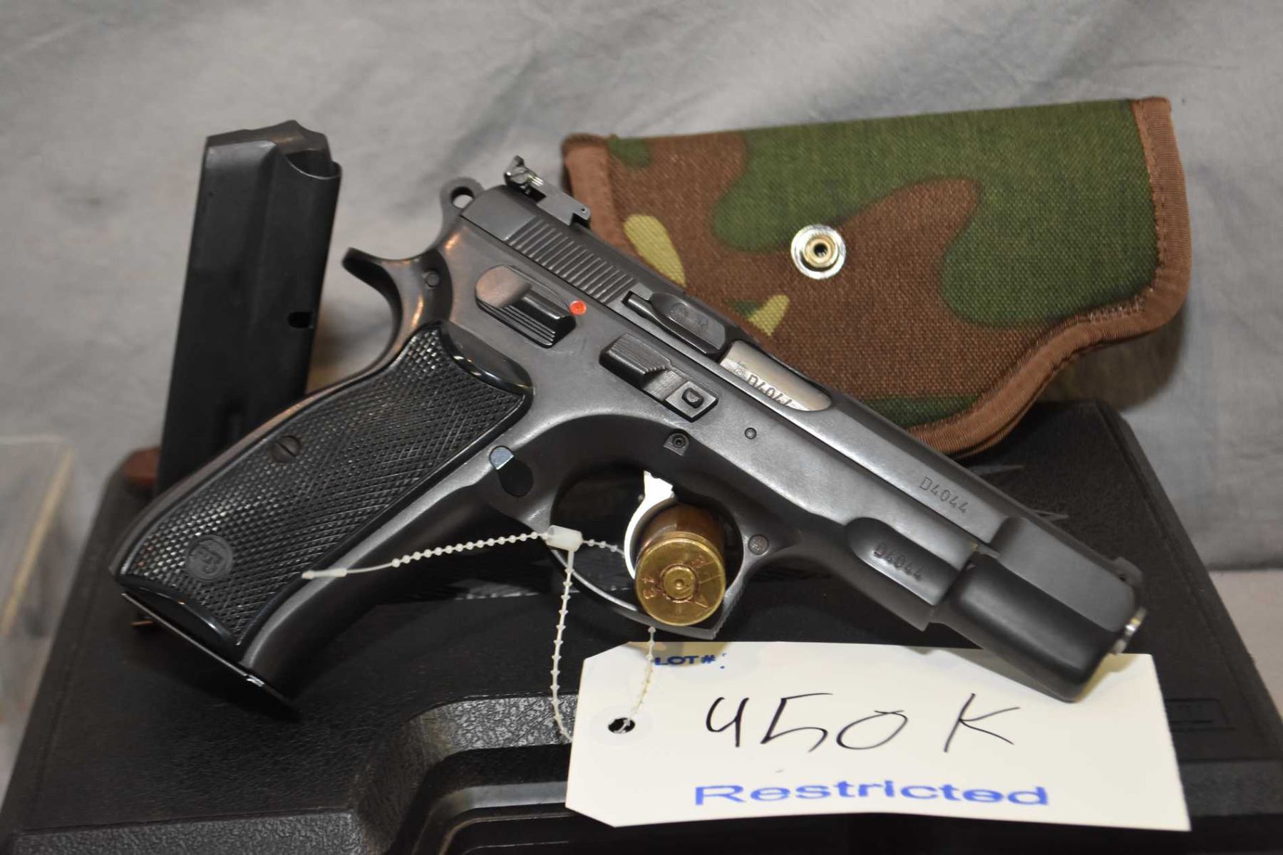 Restricted CZ 85 9mm mag fed semi-automatic pistol, fixed front sight, adjustable rear, checkered plastic grips, appears excellent condition, very little wear, includes 2 ten round magazines and nylon holster. Cert# To Follow FRT# To Follow Ser# D4044
