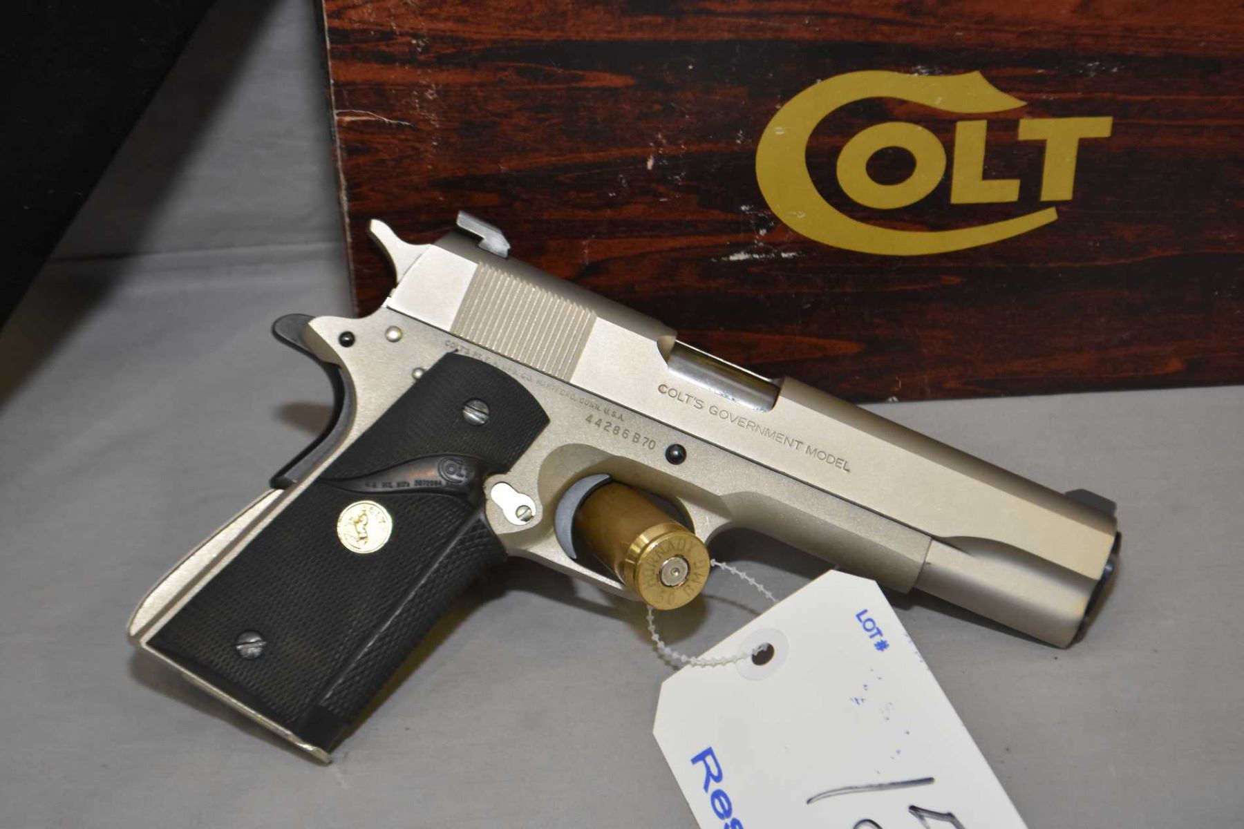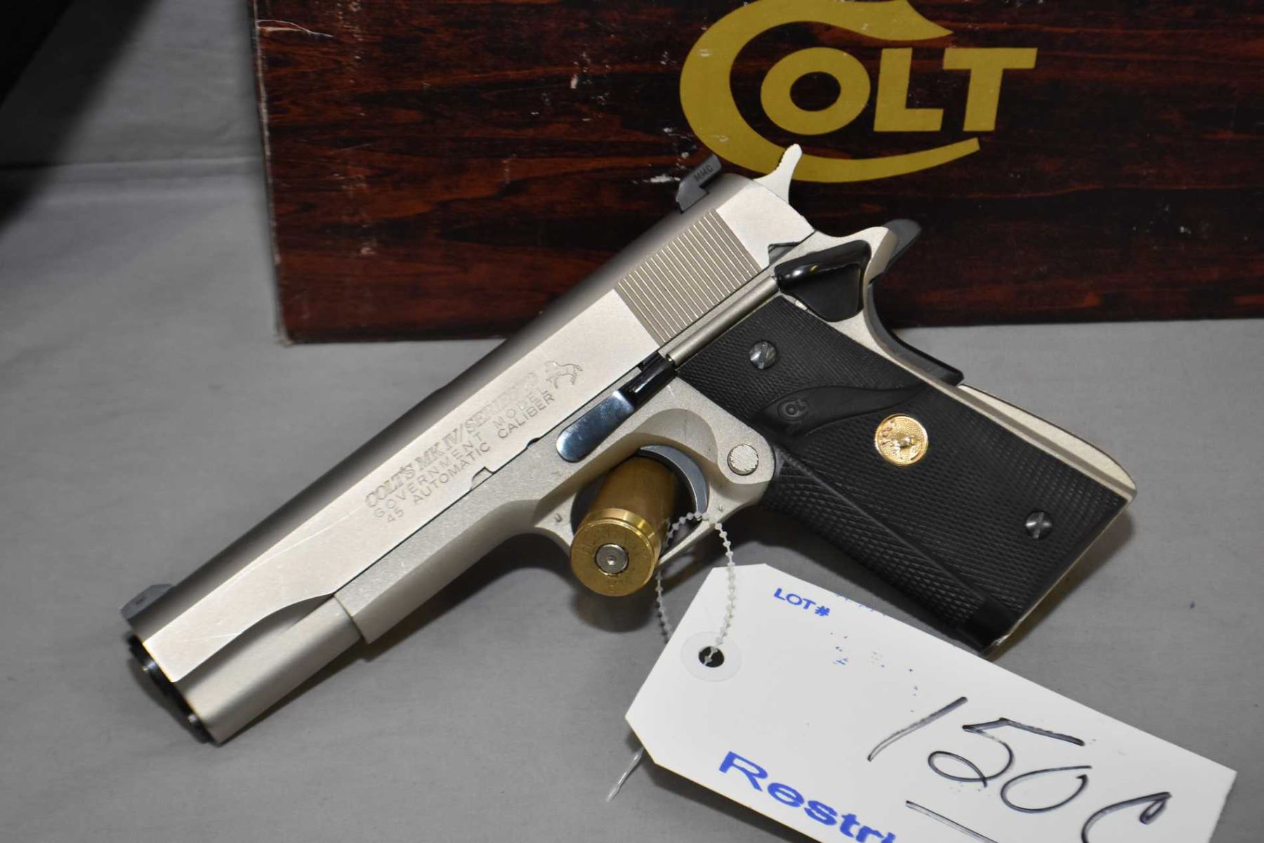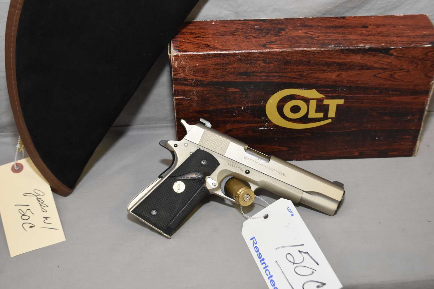 Restricted - Colt Model Government MK IV Series 70 .45 Auto Cal 7 Shot Semi Auto Pistol w/ 127 mm bbl [ appears excellent few slight marks and scratches to metal, c/w original foam lined Colt box w/ instruction booklet, satin finish with blued parts, checkered rubber Colt insignia grips, zippered pistol case ] Ser # 44286B70 Restricted Handgun Cert # 5307813 FRT # 17711 - 3