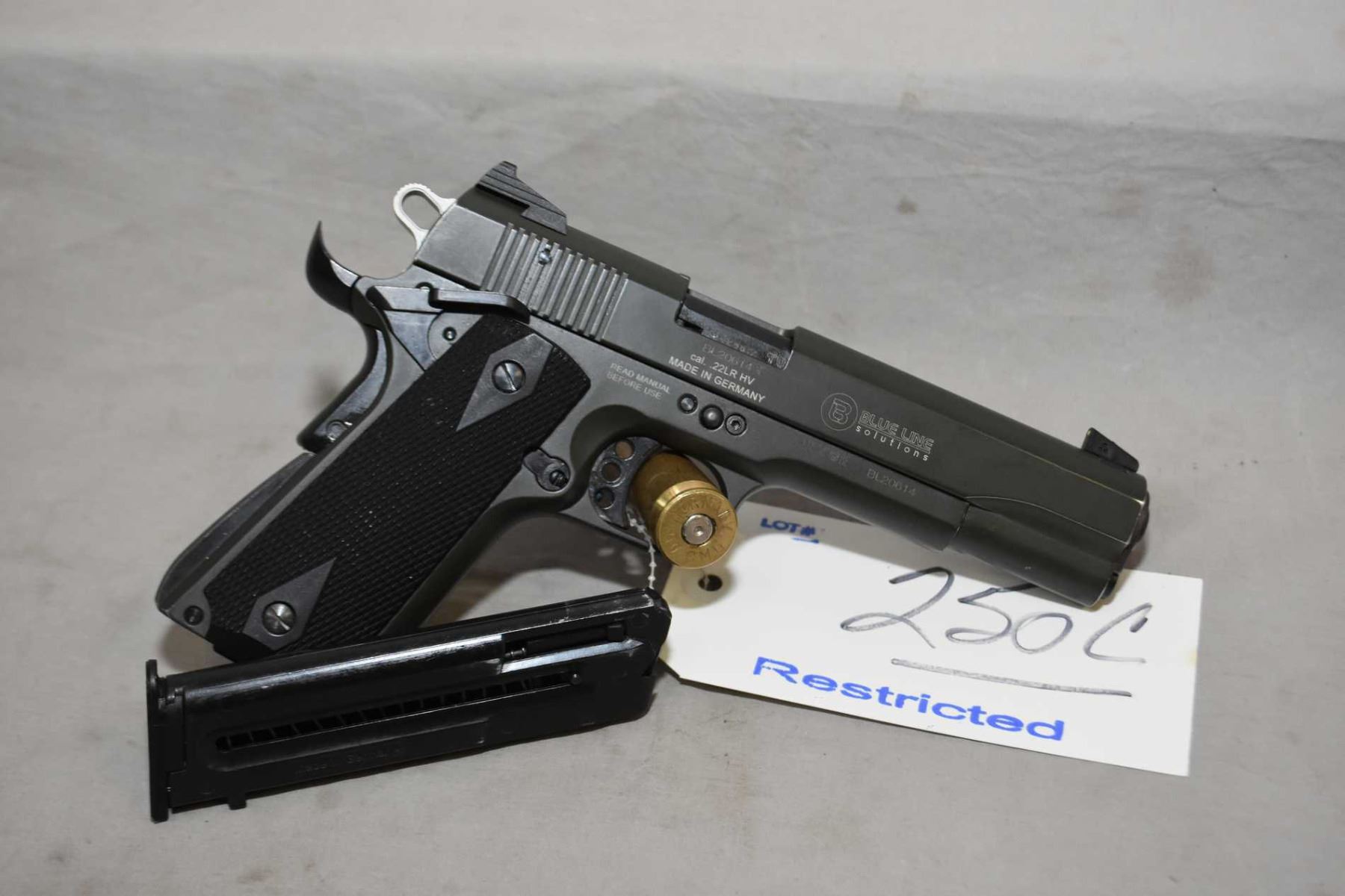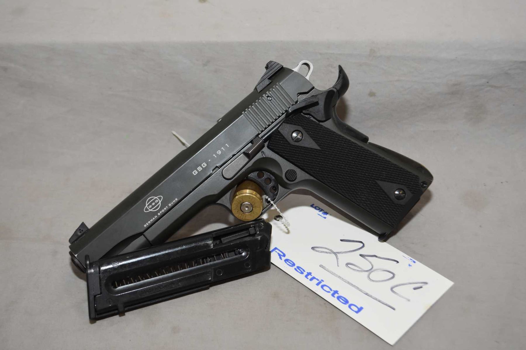 Restricted GSG ( German Sport Guns ) Model 1911 .22 LR HV Cal 10 Shot Semi Auto Pistol w/ 127 mm bbl [ black and olive green bluing with white highlights on lettering, green dot sights, black checkered grips, extra mag, shows slight wear ] Ser # BL20614 Restricted Handgun Cert # 18789174 FRT # tci ?