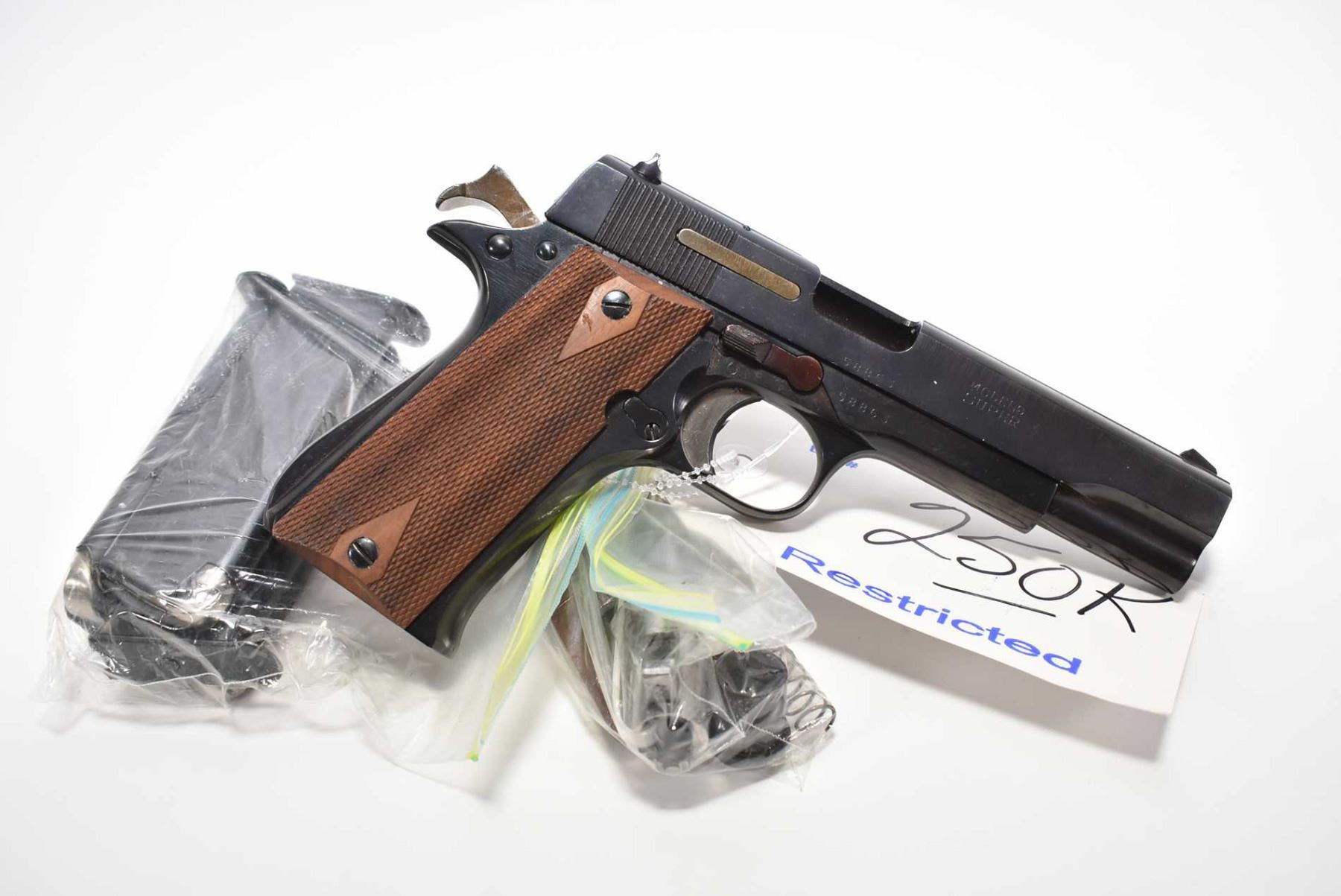 Restricted Handgun - Star Model Super .9 MM Luger Cal 8 Shot Semi Auto Pistol w/ 127 mm bbl [ blued finish, fixed sights, c/w two pairs of checkered wooden grips, three extra mags, Note : This firearm requires repair to barrel assembly, barrel and parts in bag with grips ] Ser # 58863 Restricted Handgun Cert # 18841751 FRT # 22533 - 1