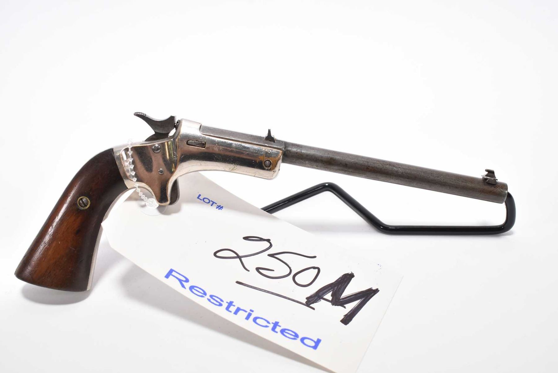 Restricted Handgun - Stevens Model Diamond No. 43 First Issue .22 LR Cal One Shot Pistol w/ 152 mm bbl [ blued barrel, brass frame with semi circular side plate, worn and flaking nickel finish to receiver, spur trigger and grip strap, firing pin in frame with bushing, plain walnut grips w/ flat butt, various marks and scratches to wood and metal ] Ser # 15529 Restricted Handgun Cert # 188893669 FRT # 22364 - 1