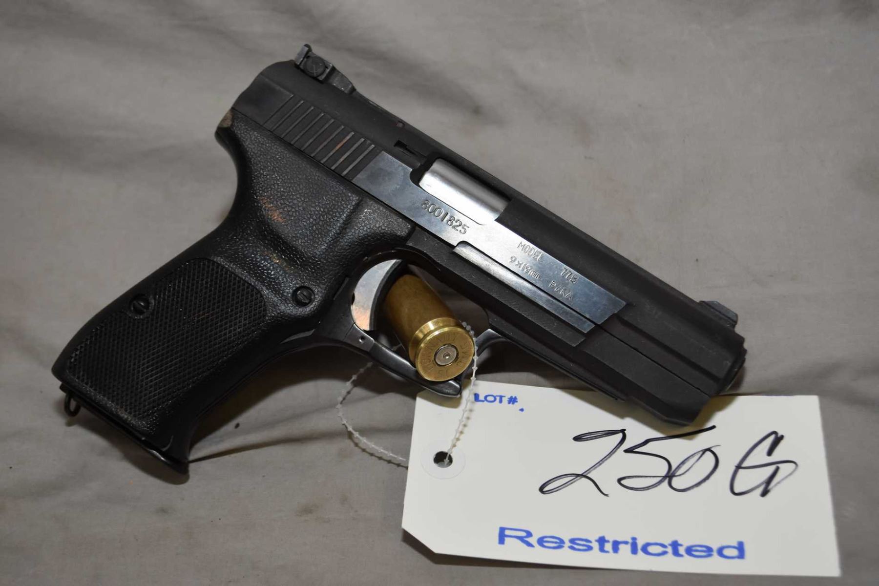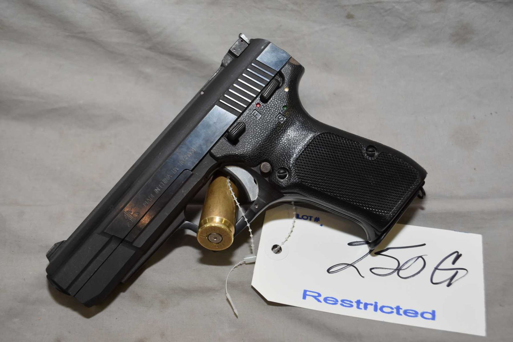 Restricted Norinco Model 77B .9 MM Luger Cal 8 Shot Semi Auto PIstol w/ 127 mm bbl [ appears unfired in original box w/ manual, blued finish, white dot style sights, c/w cleaning tool, etc.. ] Ser # 8001825 Restricted Handgun Cert # 9717798 FRT # 247469 - 3
