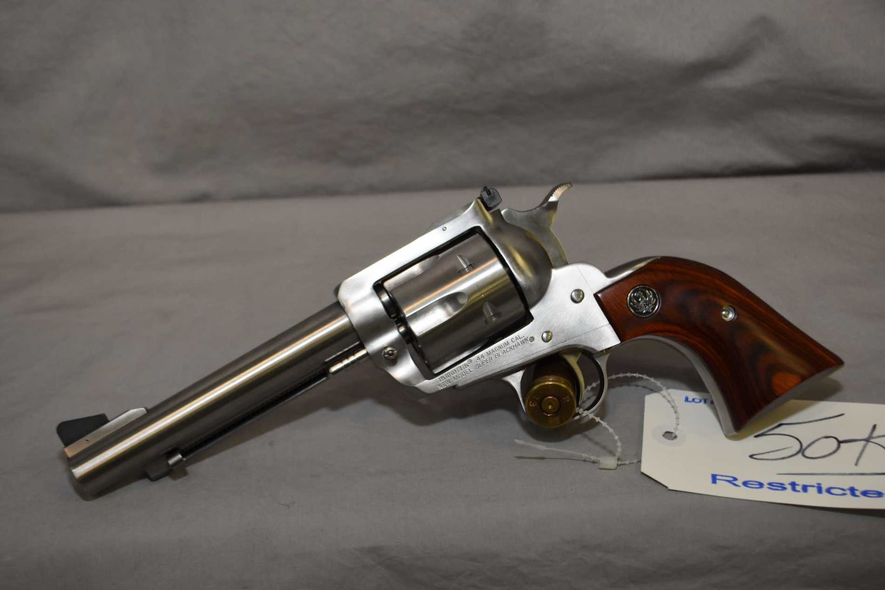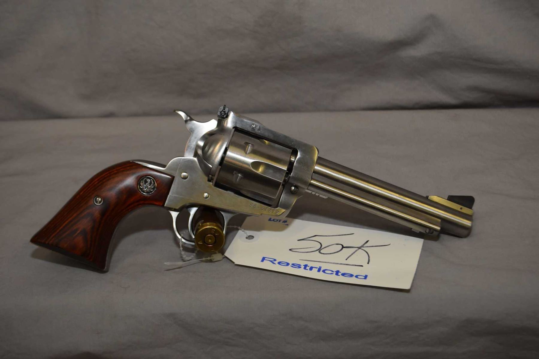 Restricted - Ruger Model New Model Super Blackhawk .44 Mag Cal 6 Shot Revolver w/ 140 mm bbl [ appears excellent, stainless finish, faint cylinder ring, laminated Ruger insignia wooden grips, adjustable rear sight, c/ orig box, booklet, etc. ] Ser # 8867872 Restricted Handgun Cert # 18923426 FRT # 22491 - 3