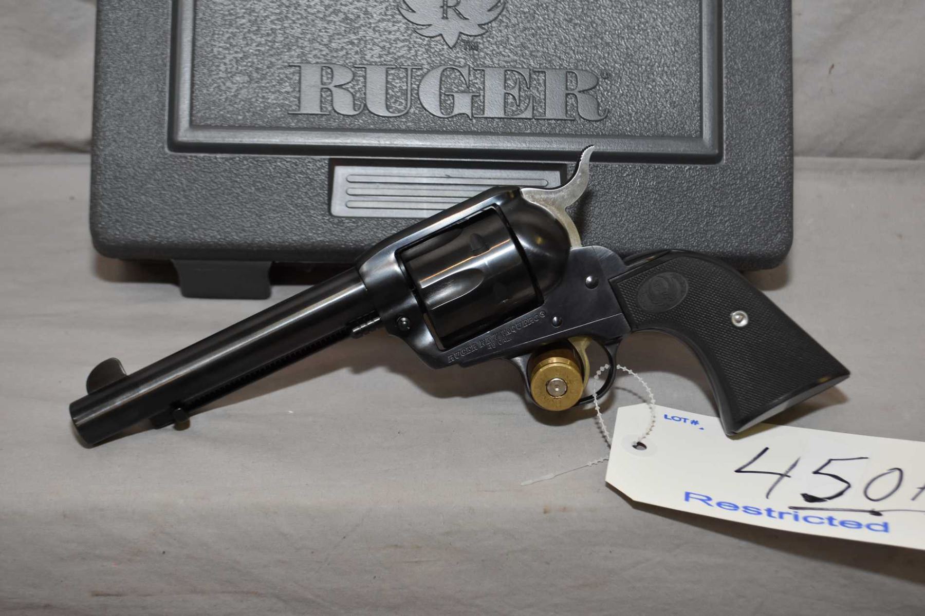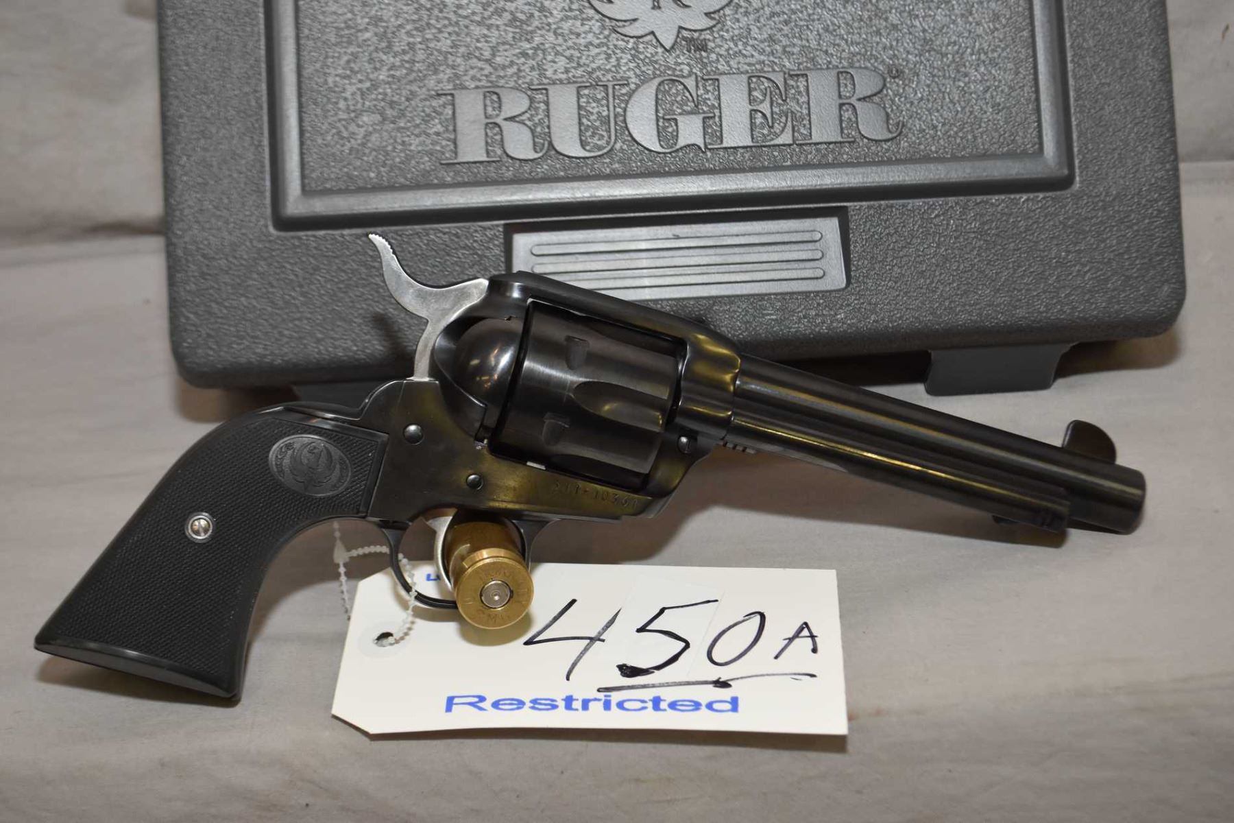 Restricted - Ruger Model New Vaquero .45 Colt Cal 6 Shot Revolver w/ 140 mm bbl [ appears excellent, in original box w/ booklet, etc., blued finish, faint cylinder ring, black checkered Ruger grips ] Ser # 51113061 Restricted Handgun Cert # 18602074 FRT # 123334 - 4
