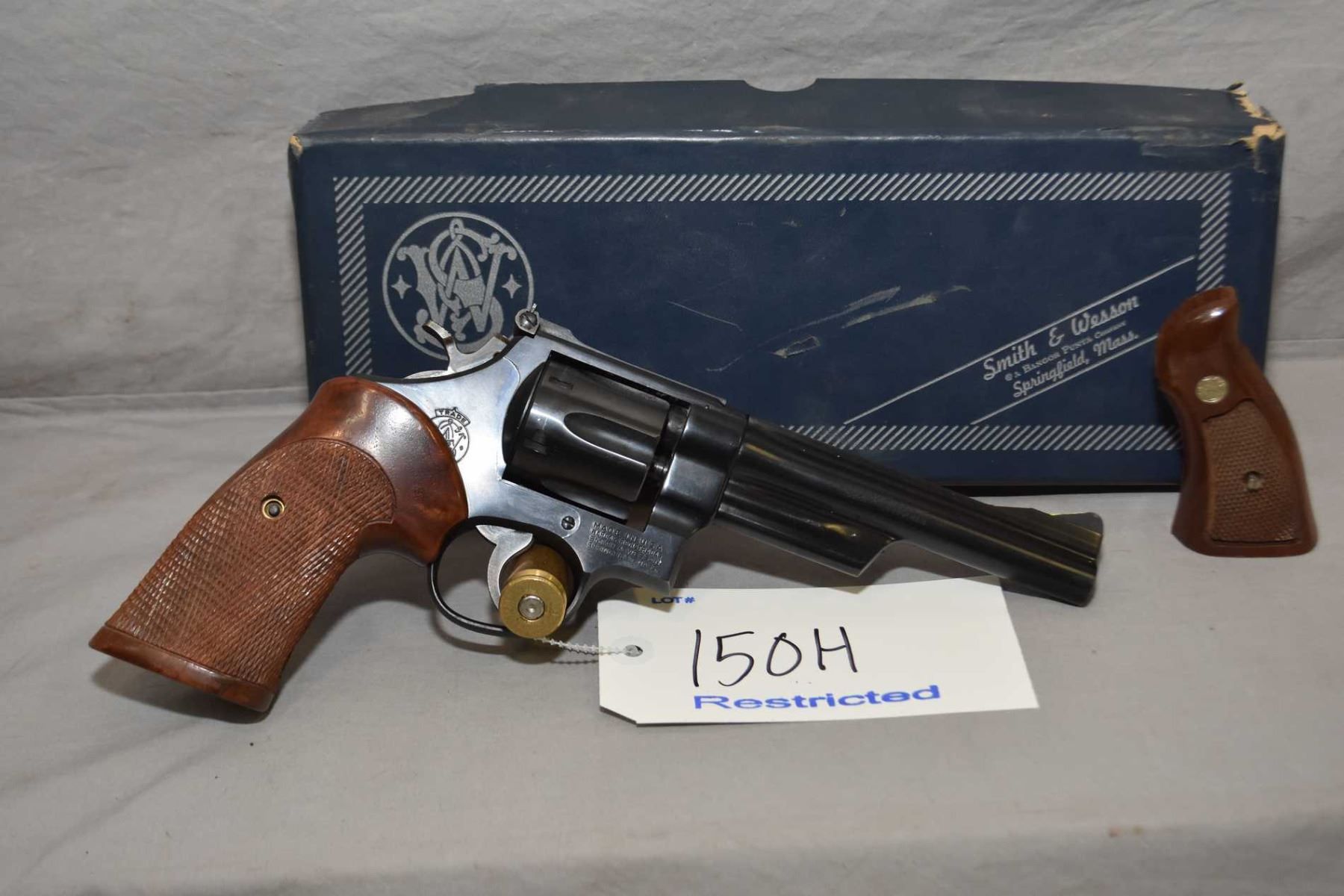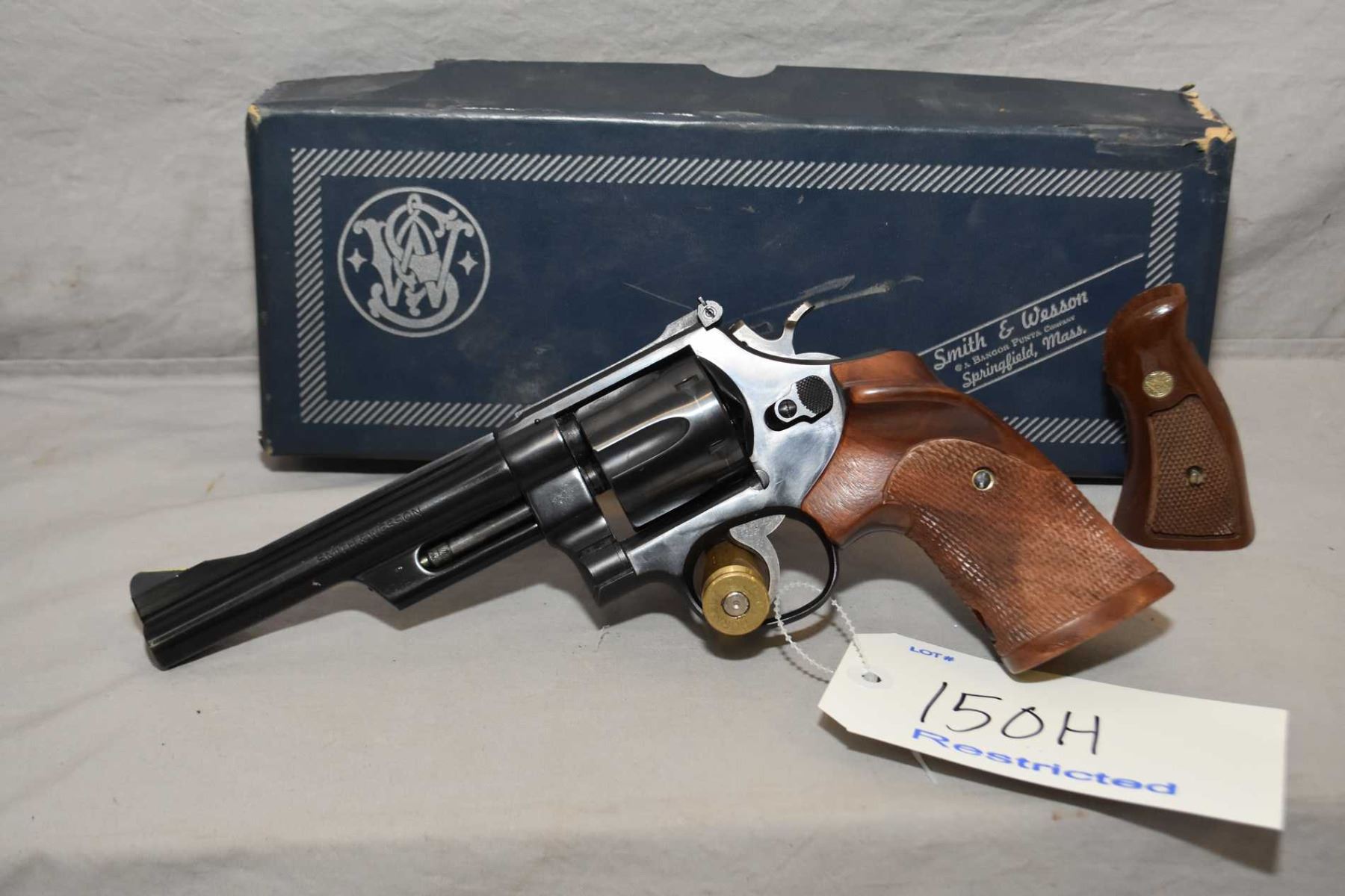Restricted - Smith & Wesson Model 28 - 2 ( Highway Patrolman ) .357 Mag Cal 6 Shot Revolver w/ 152 mm bbl [ appears excellent, blued finish, adjustable rear sight, flourescent yellow highlighted front sight, faint cylinder ring, case colored trigger and hammer, with checkered target right hand grip, and original walnut checkered Smith & Wesson insignia grips, c/w original cardboard box ] Ser # N93741 Restricted Handgun Cert # tci Ward's FRT # 21950-3