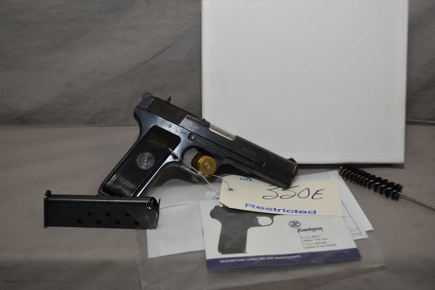Restricted - Zastava Arms Model M57 TT 7.62 MM Tokarev Cal 9 Shot Semi Auto Pistol w/ 116 mm bbl [ appears v - good, in original box, with booklet, and extra mag, cleaning brush, blued finish, black grips, few slight marks to metal ] Ser # 223229 Restricted Handgun Cert # 18863649 FRT # 123835 - 1