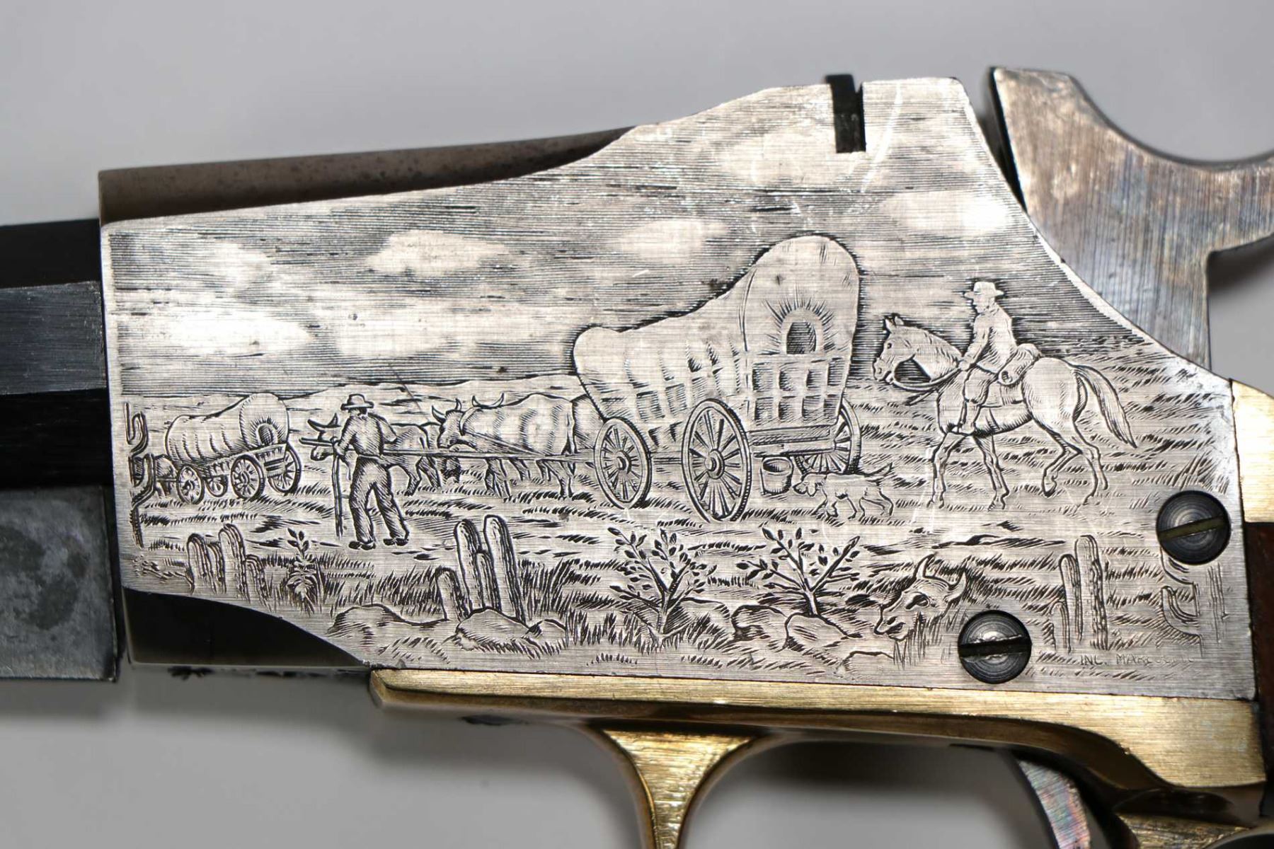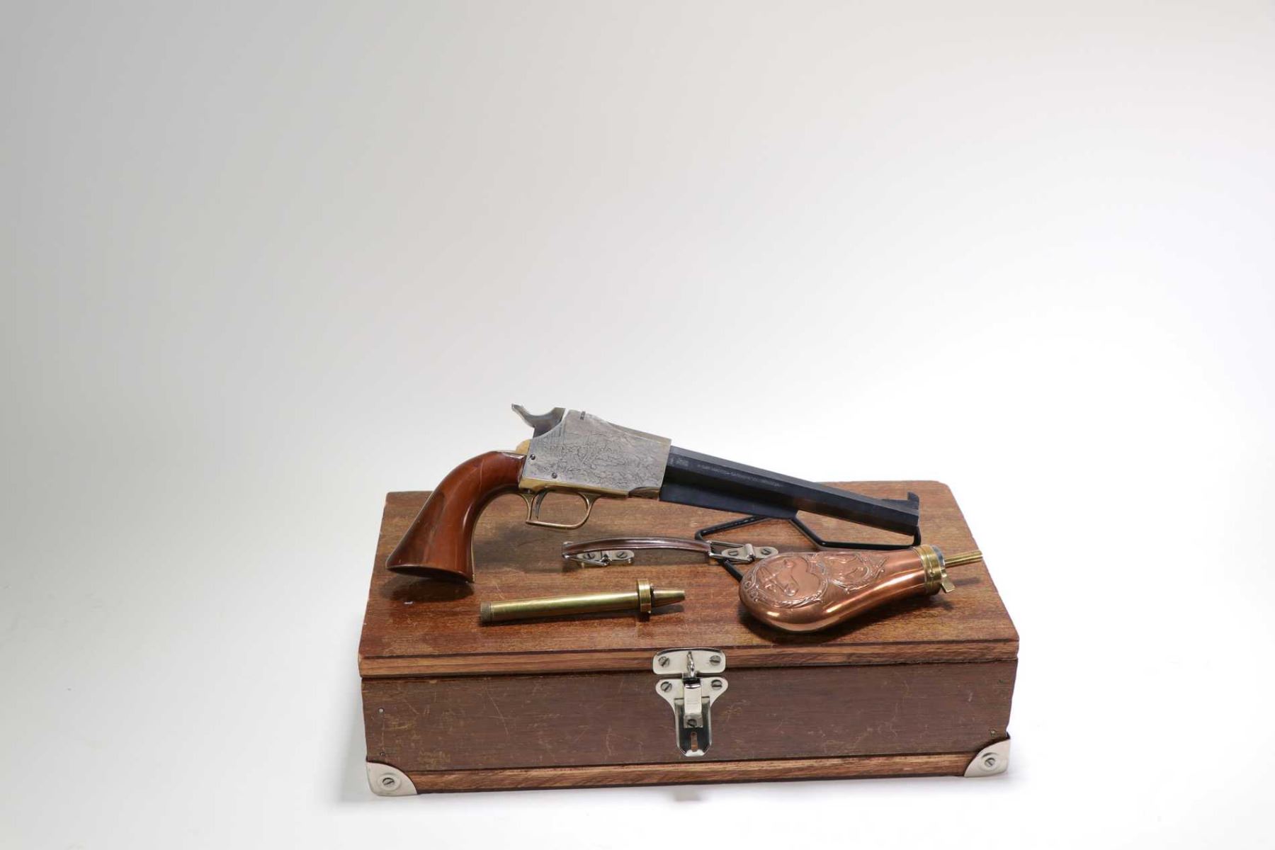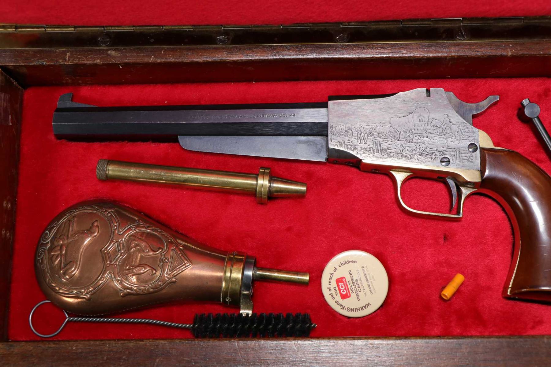 Restricted handgun ARMI San Marco model Tingle (1960 copy), .44 cal percussion single shot Muzzle loader, w/ bbl length 169mm [Blued octagonal barrel, fixed front and adjustable rear sight, case hardened receiver engraved on left side with wagon train scene and right side with coal miner and bears. Brass trigger guard and frame and smooth wooden grips. Minor handling marks to wood and metal. Includes a fitted wooden case with accessories including power flask, brass powder measure,selection of CCI caps, nipple tools etc. Note no ramrod] serial # 11797 , certificate # 19272244, FRT # 15512-2 PAL required