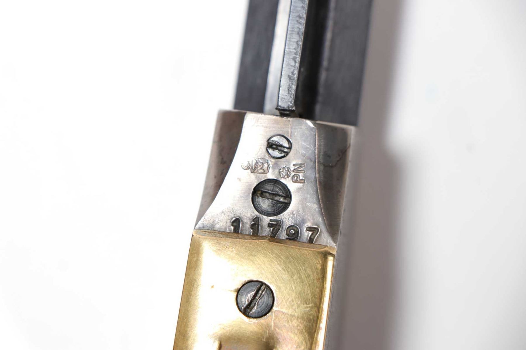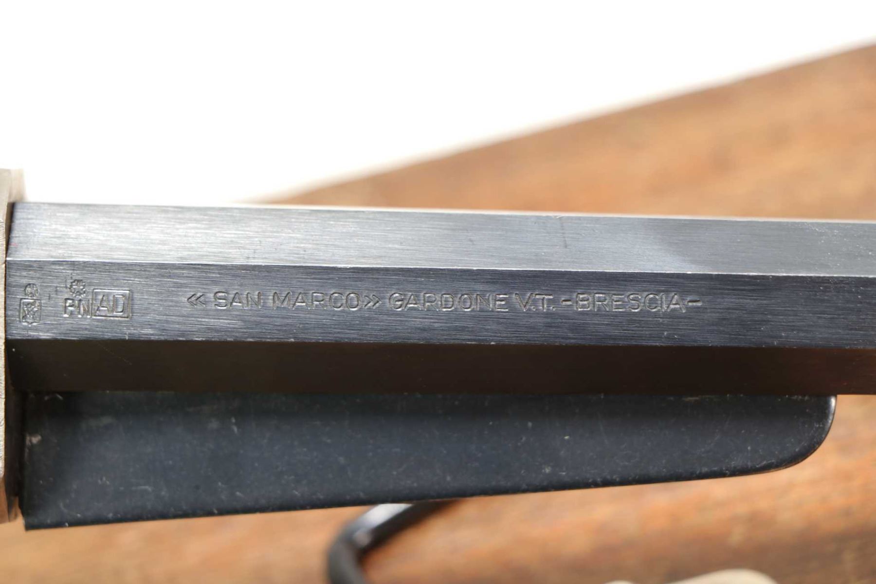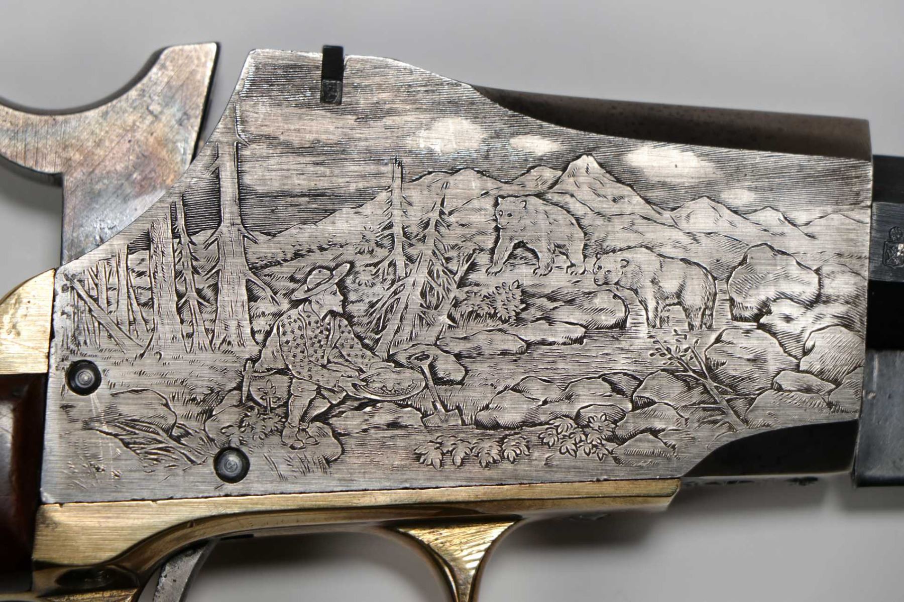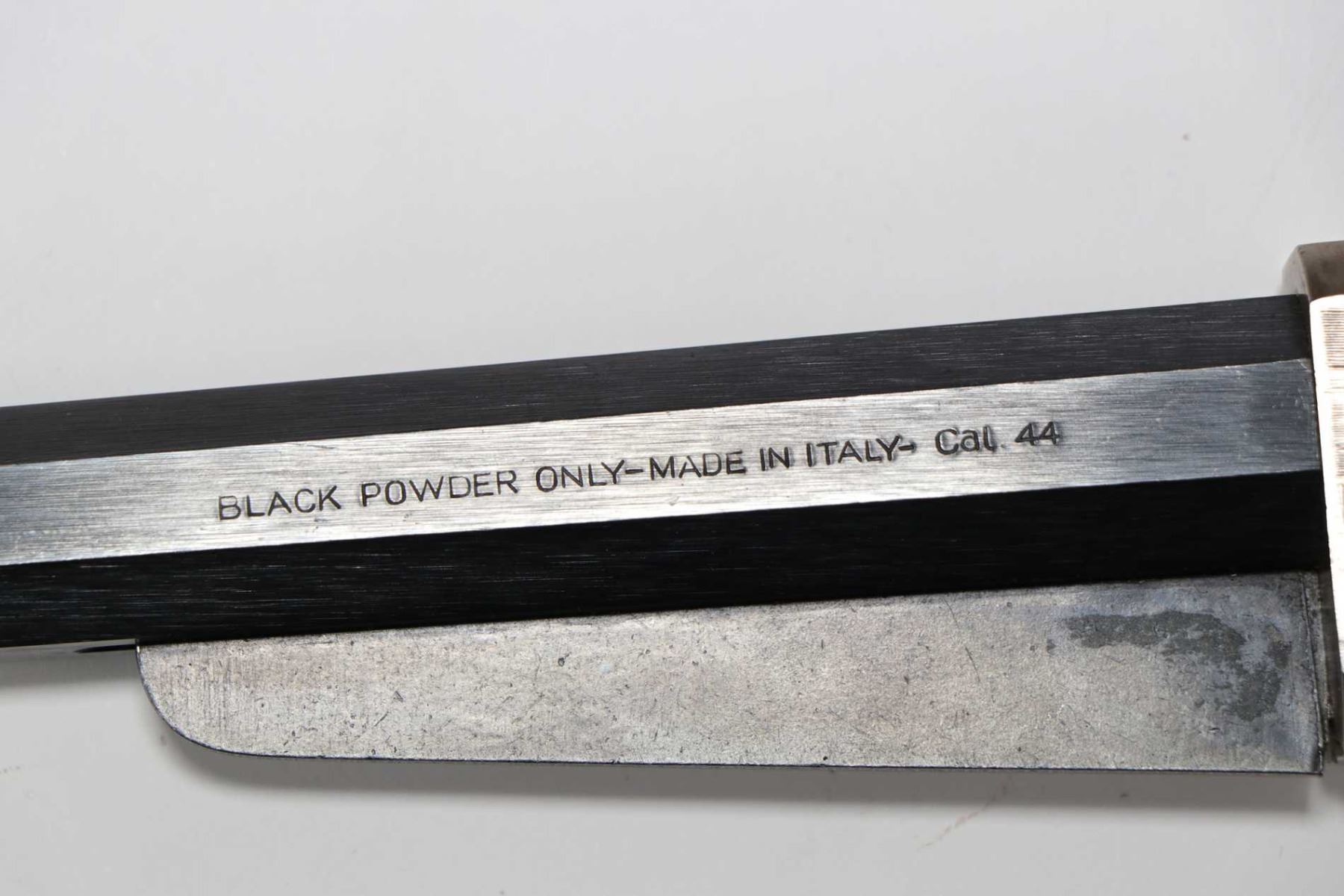 Restricted handgun ARMI San Marco model Tingle (1960 copy), .44 cal percussion single shot Muzzle loader, w/ bbl length 169mm [Blued octagonal barrel, fixed front and adjustable rear sight, case hardened receiver engraved on left side with wagon train scene and right side with coal miner and bears. Brass trigger guard and frame and smooth wooden grips. Minor handling marks to wood and metal. Includes a fitted wooden case with accessories including power flask, brass powder measure,selection of CCI caps, nipple tools etc. Note no ramrod] serial # 11797 , certificate # 19272244, FRT # 15512-2 PAL required