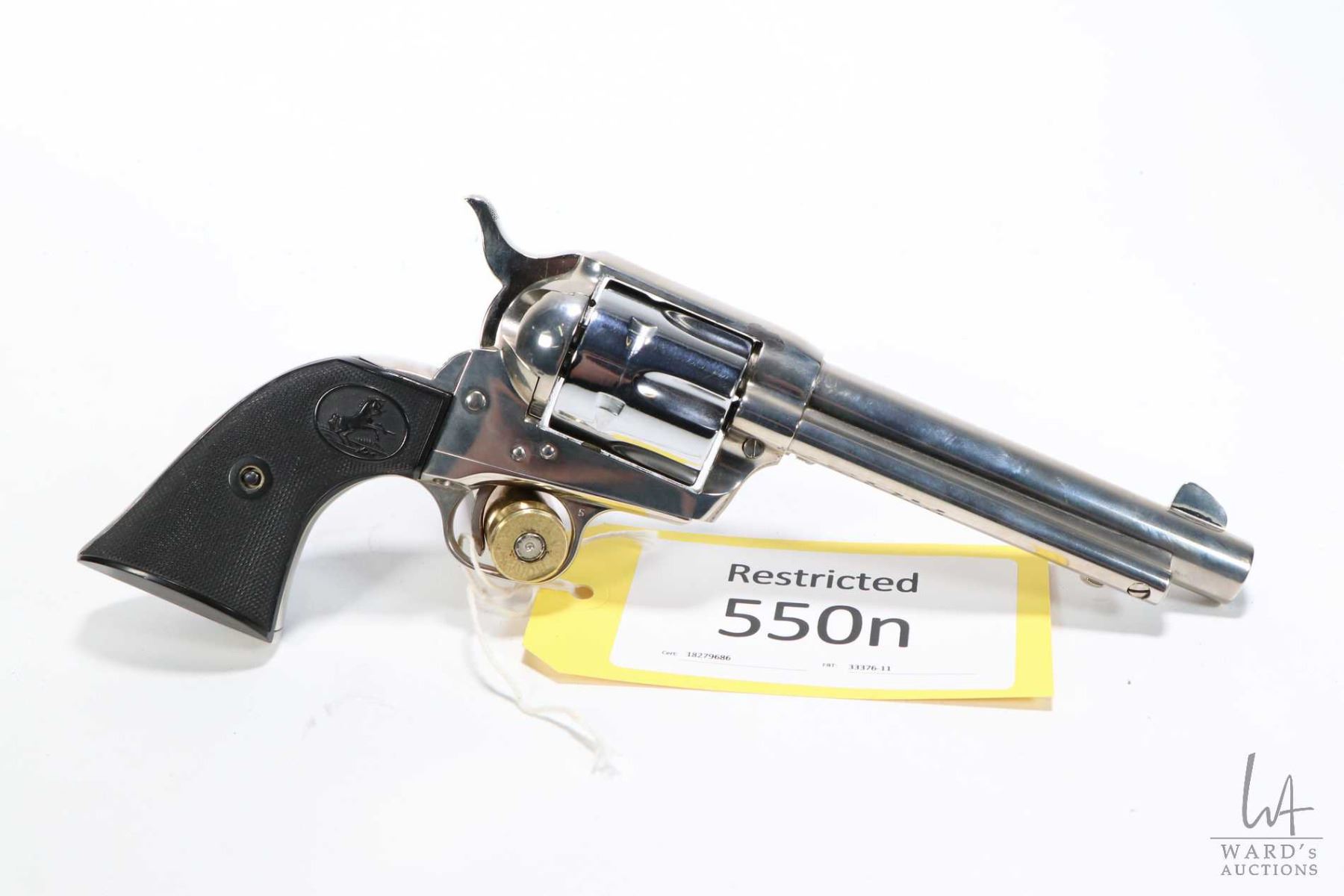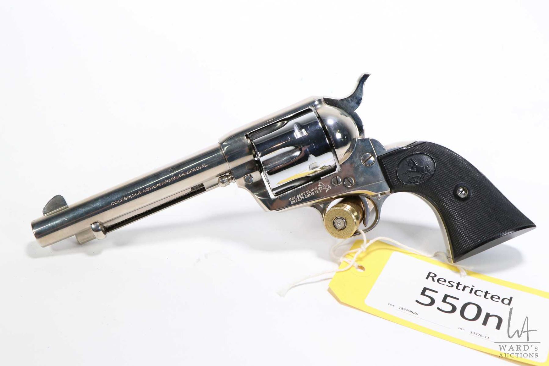 Restricted handgun Colt model 1873 Single Action Army, .44 Spcl six shot single action, w/ bbl length 140mm [Nickel plated barrel and frame with what appears to be chrome plated cylinder. Fixed sights, branded plastic checkered grips. Small plating flake on frame just above right side of breach. Slight cylinder ring, otherwise appears to have had little use with only minor use, handling and storage marks.] serial # 28234SA, certificate # 18279686, FRT # 33376-11 PAL required