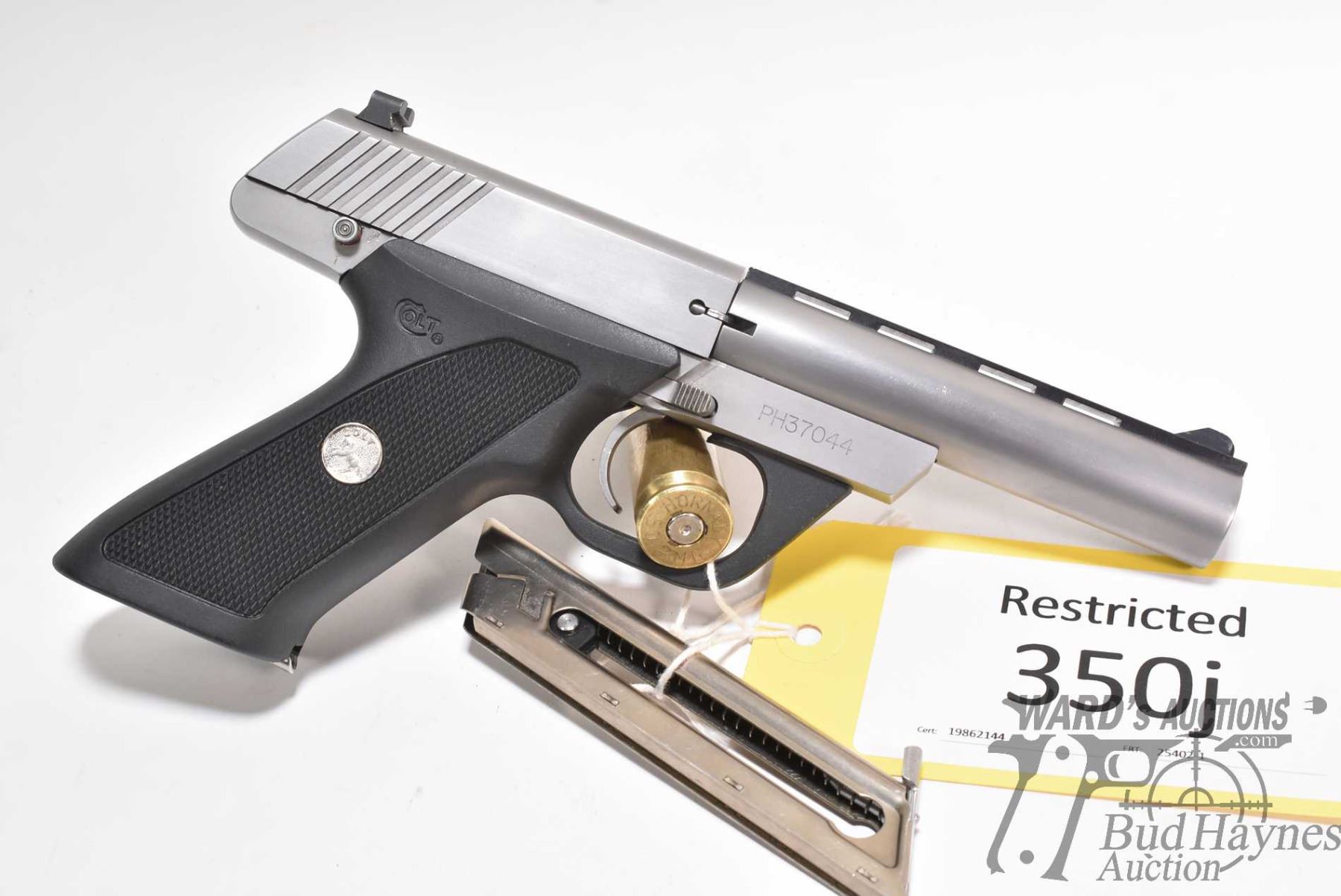 Restricted handgun Colt model Colt 22, .22 LR ten shot semi automatic, w/ bbl length 114mm [Stainless steel heavy bull barrel. Fixed front and rear sights. Branded checkered grips. Includes two detachable box magazine. Appears to have had on light use with only minor use, handling and storage marks.] serial # PH37044, certificate # 19862144, FRT # 25402-1 PAL required