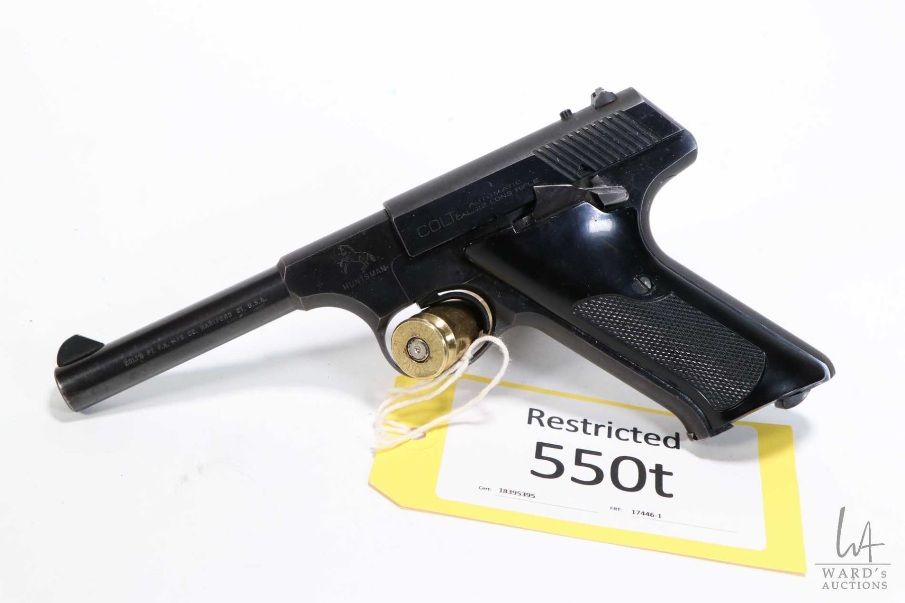 Restricted handgun Colt model Huntsman, .22 LR ten shot semi automatic, w/ bbl length 114mm [Blued finish with fixed front and rear sights. Black plastic ambidextrous checkered grips. Very light bluing wear on high point. Otherwise appears to have only light use with only minor use, handling and storage marks. Includes one Colt branded detachable magazine.] serial # 97331C, certificate # 18395395, FRT # 17446-1 PAL required