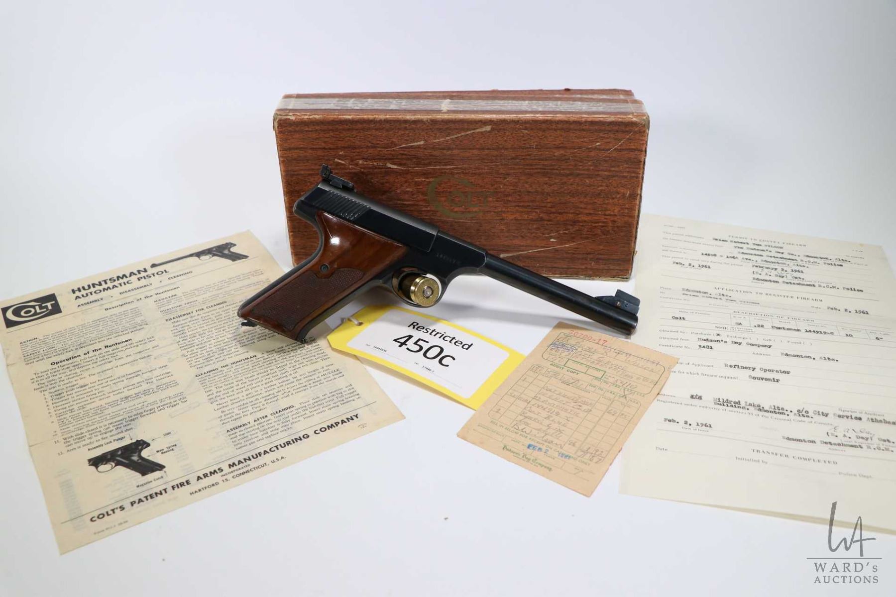 Restricted handgun Colt model Huntsman, .22 LR ten shot semi automatic, w/ bbl length 152mm [Blued barrel and receiver. Fixed front and target adjustable rear sights. Checkered wooden grips. Includes one Colt brand detachable magazine. Bluing worn in handling and holster areas with a couple of small pits on barrel and rough storage or tooling marks on both side of slide on serration. Includes original box and tri-fold parts list and care instructions plus 1961 vintage original receipt of $69.95 plus original registration application and permit to convey of February 1961.] serial # 144919C, certificate # 18443336, FRT # 17446-2 PAL required