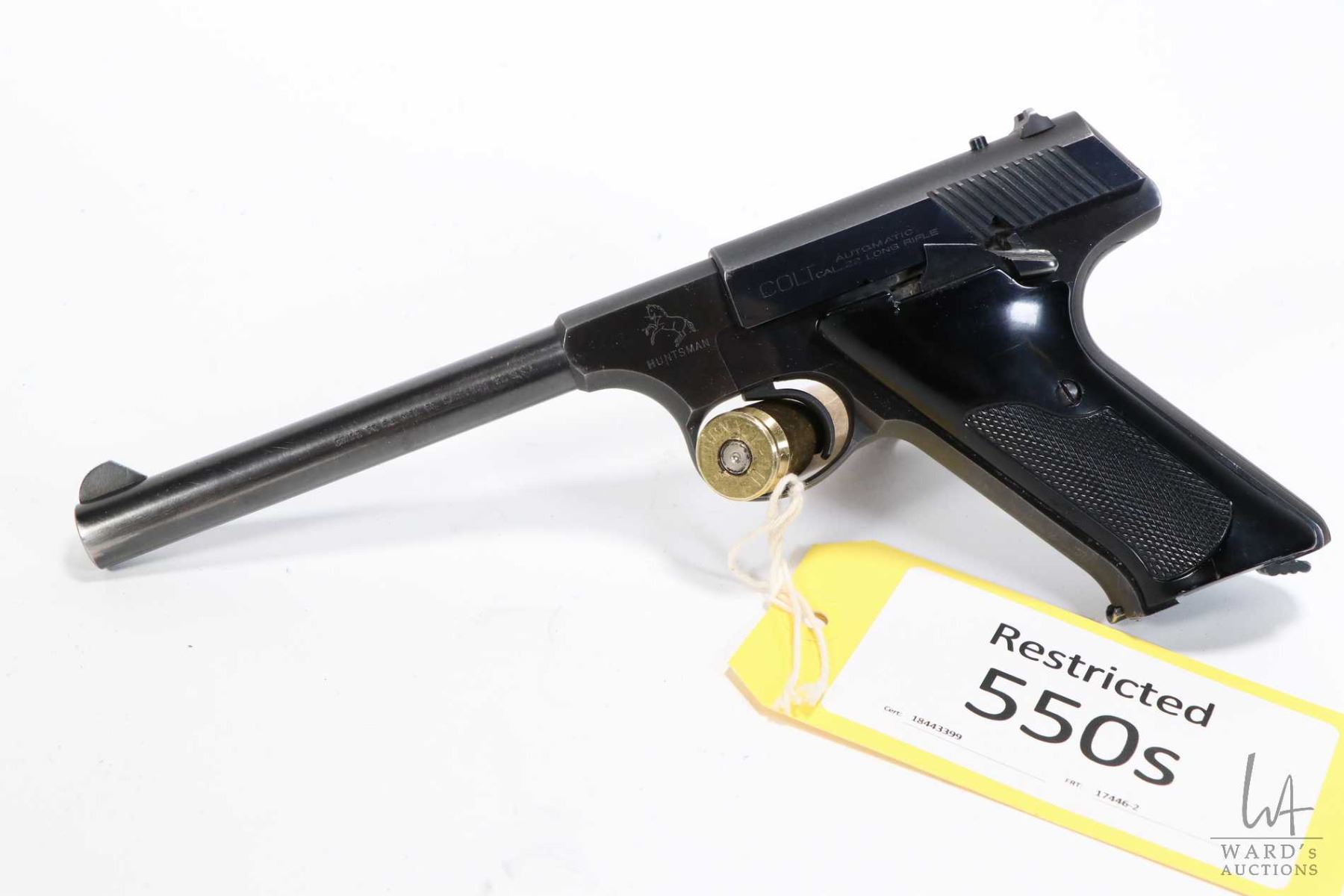 Restricted handgun Colt model Huntsman, .22 LR ten shot semi automatic, w/ bbl length 152mm [Blued finish with fixed sights. Black plastic checkered ambidextrous grips. Holster wear to bluing on muzzle and expected high points. Includes one Colt brand magazine. Appears to have had light use with only minor use, handling and storage marks.] serial # 100817C, certificate # 18443399, FRT # 17446-2 PAL required