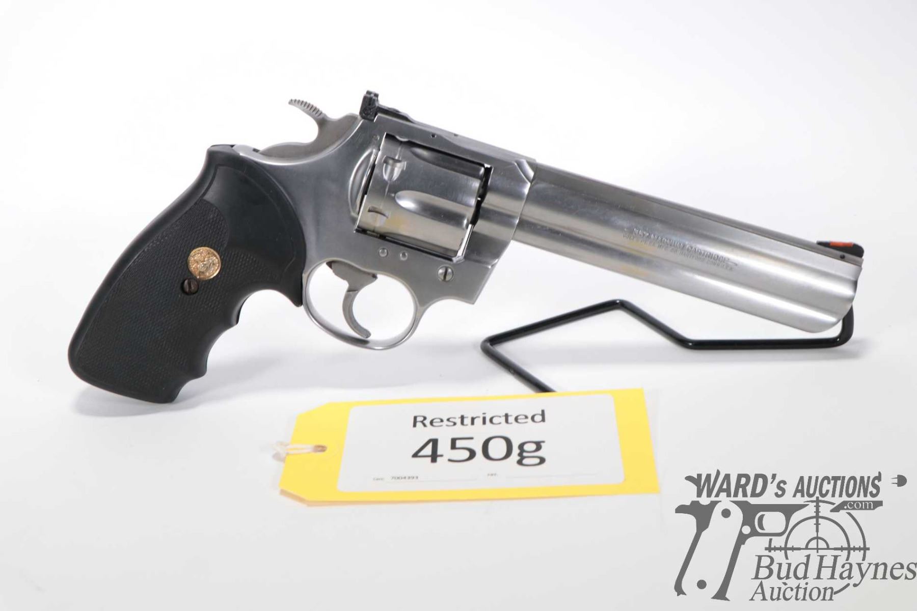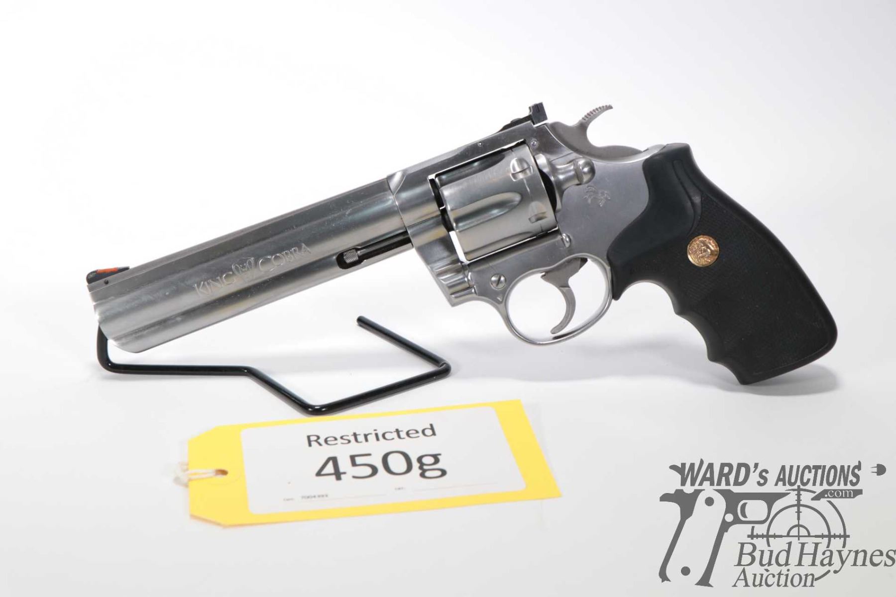 Restricted handgun Colt model King Cobra, 357 Mag. Six shot double action revolver, w/ bbl length 152mm [Stainless steel. Fixed front and adjustable rear sights. Branded soft touch grips with finger grooves. Mechanically appears near excellent. Visible cylinder ring. Otherwise only minor use, handling or storage marks.] serial # CK1729, certificate # 7004393, PAL required. Descriptions subject to change.
