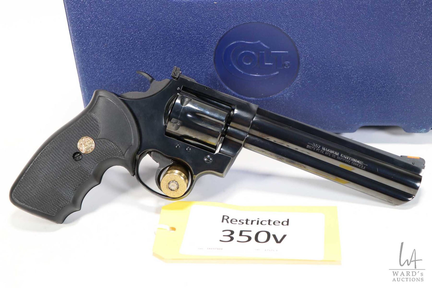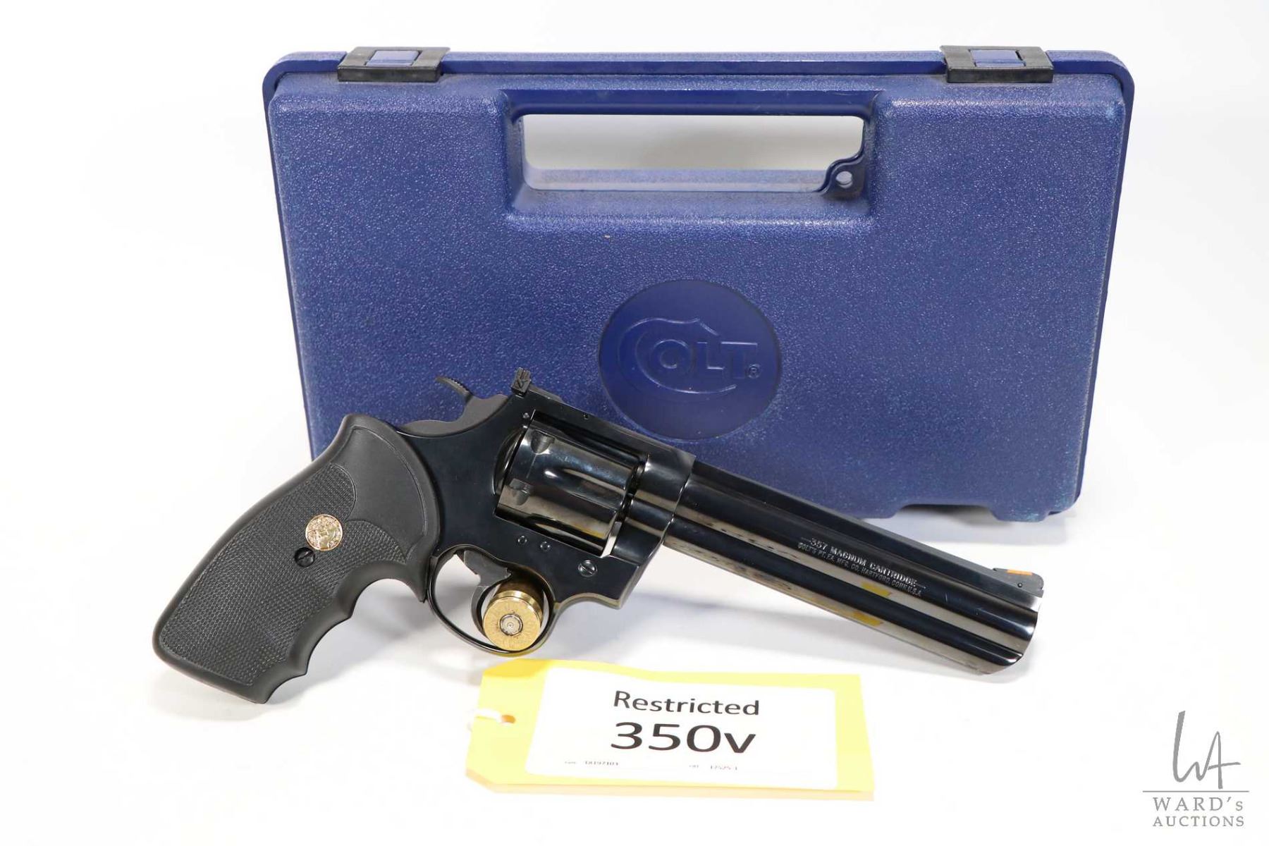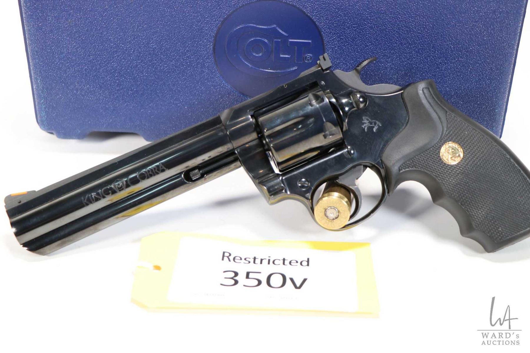Restricted handgun Colt model King Cobra, .357 Mag six shot double action revolver, w/ bbl length 152mm [Polished blue finish. Fixed front and adjustable rear sights. Colt branded soft touch rubber grips with finger grooves. Appears to have had very little use with slight cylinder ring and minor use, storage and handling marks. Includes original box and manual.] serial # KK6536, certificate # 18197103, FRT # 17525-3 PAL required