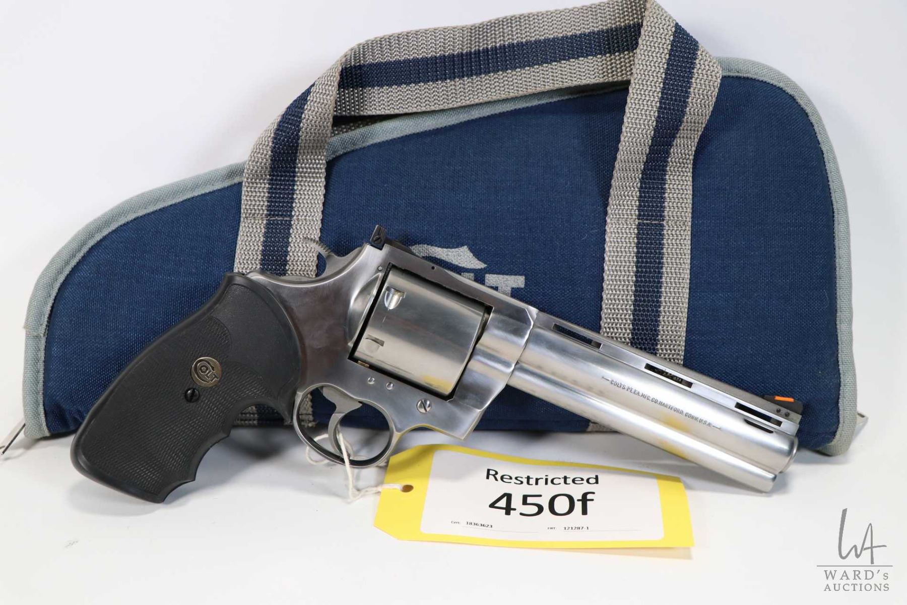 Restricted handgun Colt model Kodiak, .44 Mag six shot double action revolver, w/ bbl length 152mm [Stainless steel with fixed front and adjustable rear sights. Colt branded Pachmayr soft touch grips with finger grooves. Appears to have had very light use with slight ring on non-fluted cylinder and minor use and handling marks. Includes Colt branded soft case.] serial # CKA1182, certificate # 18363623, FRT # 121287-1 [