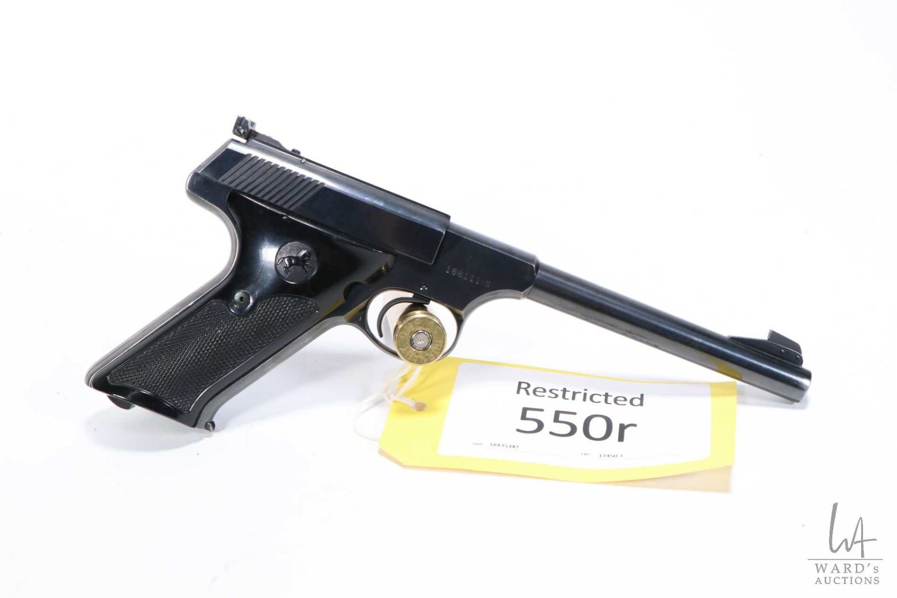 Restricted handgun Colt model Woodsman Target, .22 LR ten shot semi automatic, w/ bbl length 152mm [Blued finish with fixed front and adjustable rear sights. Checkered black plastic grips with right side strong hand thumb rest. Slight holstering wear on muzzle and high point. Bluing worn in front and backstrap, otherwise very little use, storage and handling marks. Includes one Colt branded detachable magazine.] serial # 188111S, certificate # 18435347, FRT # 17450-1 PAL required