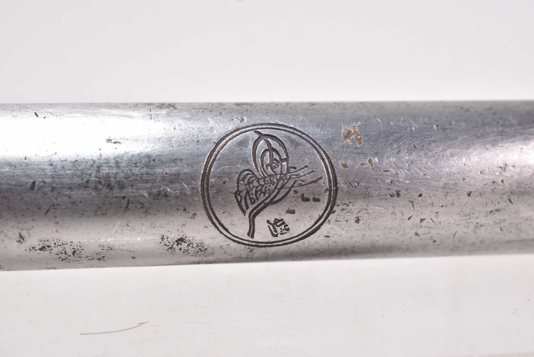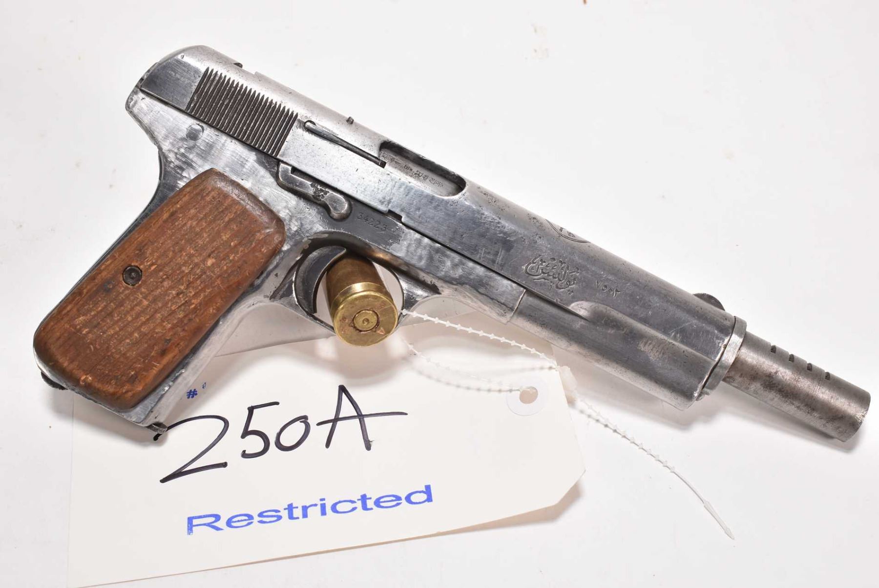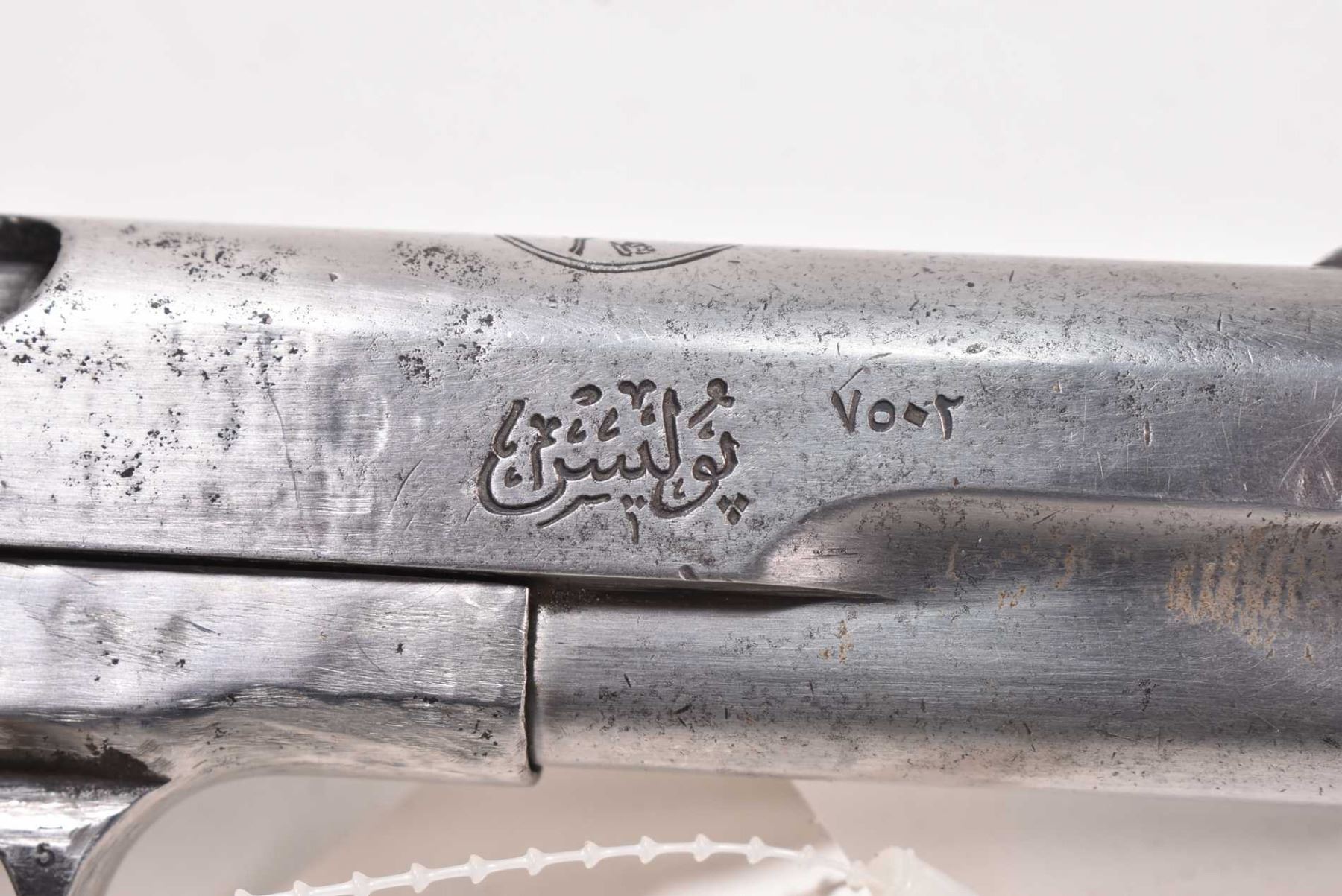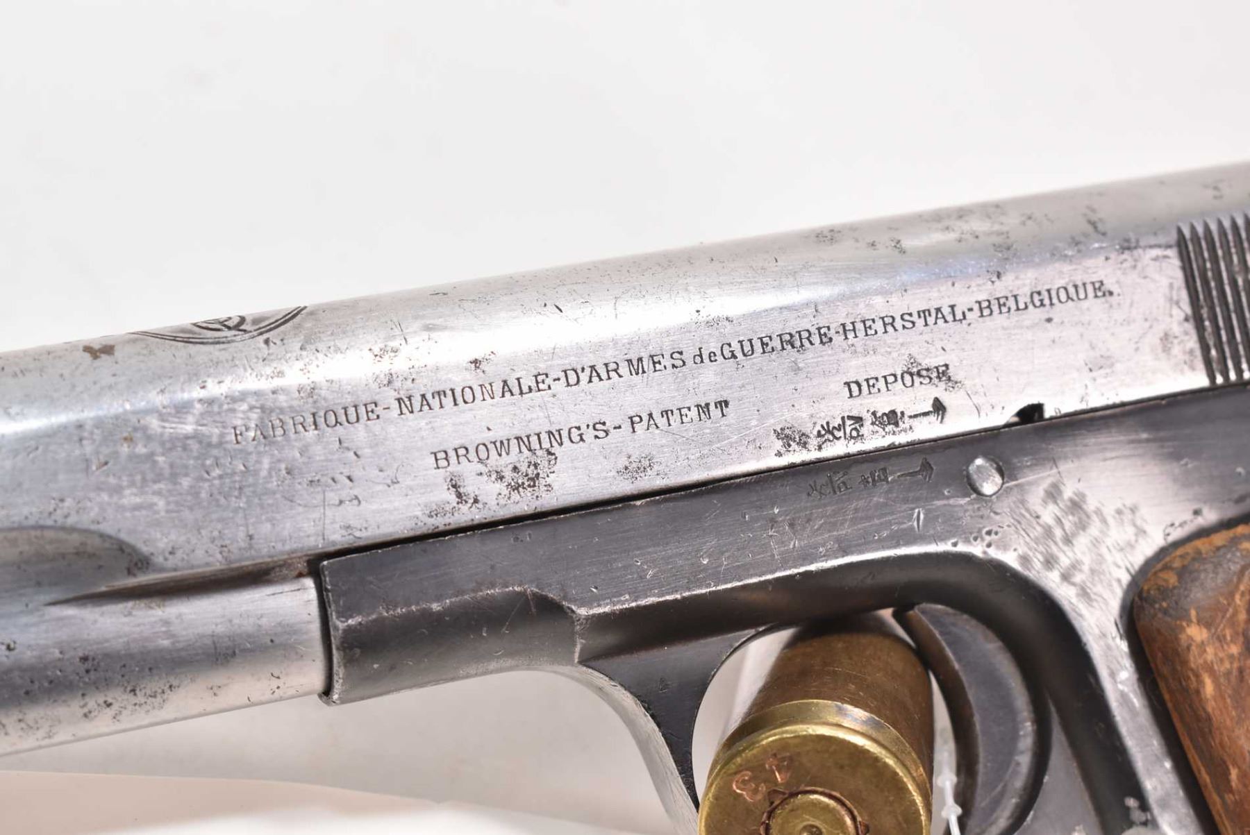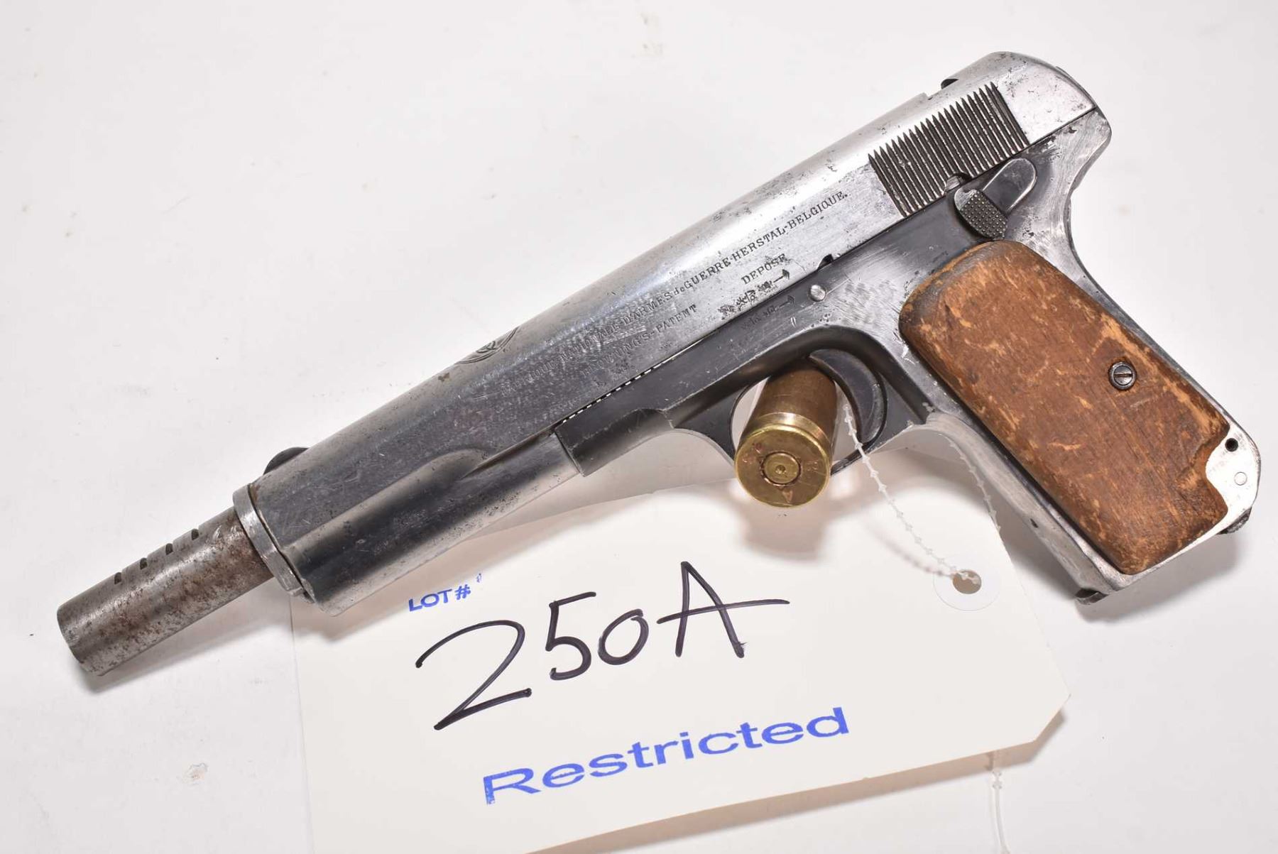 Restricted handgun FN Browning model 1903, 9mm Browning Long 7 shot semi automatic, w/ bbl length 127mm [Originally blued finish, fixed front and missing rear sights and handmade wooden grips. Originally blued finished has been crudely removed leaving tooling marks overall. Ottoman Empire sultan's crest engraved on top of slide, Arabic writing translated to"7502" and Farsi writing on right side. Fitted with a compensator/bushing combination, appears shop made. See photos for proof markings including left side of slide and chamber, as visible through injection port. Includes one seven round magazine.] serial # 34223 , certificate # 19438666 , FRT # 16755-2 PAL required