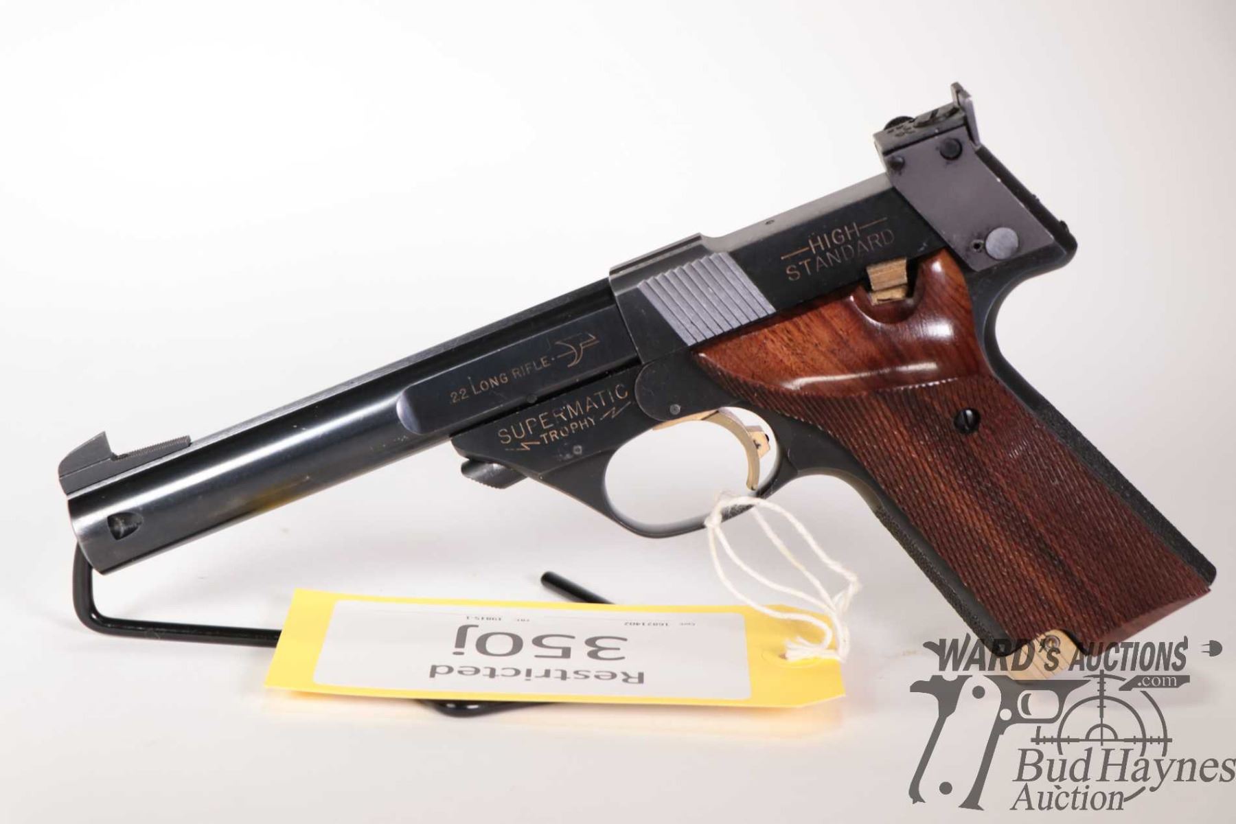 Restricted handgun High Standard model Supermatic Trophy, 22LR ten shot semi automatic, w/ bbl length 140mm [Blued finish. Fixed front and target adjustable rear sights. Checkered wooden grips with right strong hand thumb rest. Gold toned accents on mag release, trigger and safety. Includes one detachable magazine. Matching serial number on frame and slide. Heavy bull barrel is threaded and notched to accommodate muzzle devices and weights, not included. Mechanically appears to function well. Front strap is texturized. Minor bluing wear in use and handling areas. Other use, handling and storage marks.] serial # ML31042, certificate # 16821402, FRT # 19815-1 PAL required Description subject to change. Please check back for any updates.