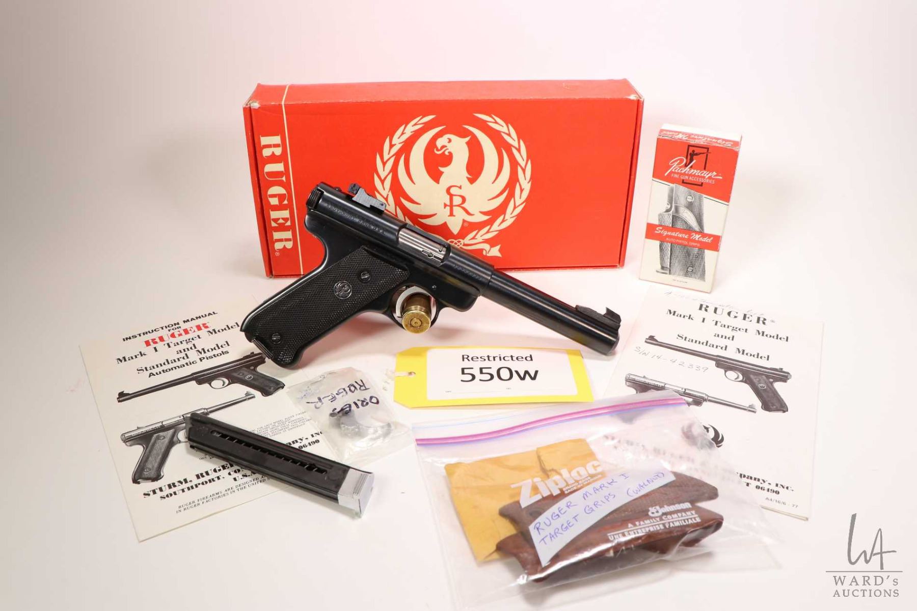 Restricted handgun Ruger model MK I Target, .22 LR ten shot semi automatic, w/ bbl length 140mm [Blued bull barrel and receiver. Fixed front and adjustable rear sights. Fitted with branded black plastic checkered grips. Fitted with Clark competition trigger and includes original trigger, two detachable magazines, boxed Pachmayr rubber grips and Ruger branded wooden checkered grips with right strong hand thumb rest, original owner's manual and box. Appears to have had light use with minor holstering and handling marks] serial # 1442339, PAL required